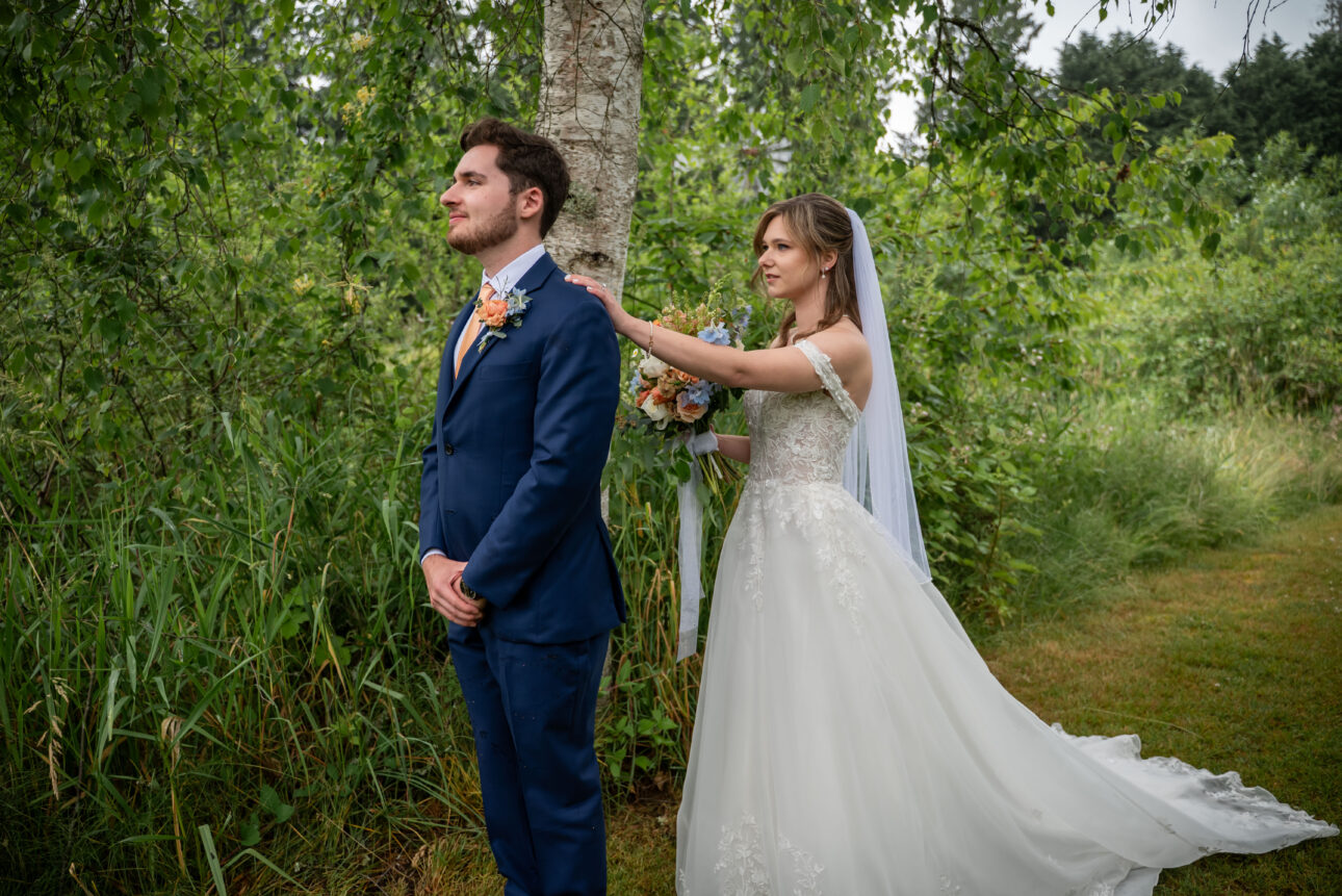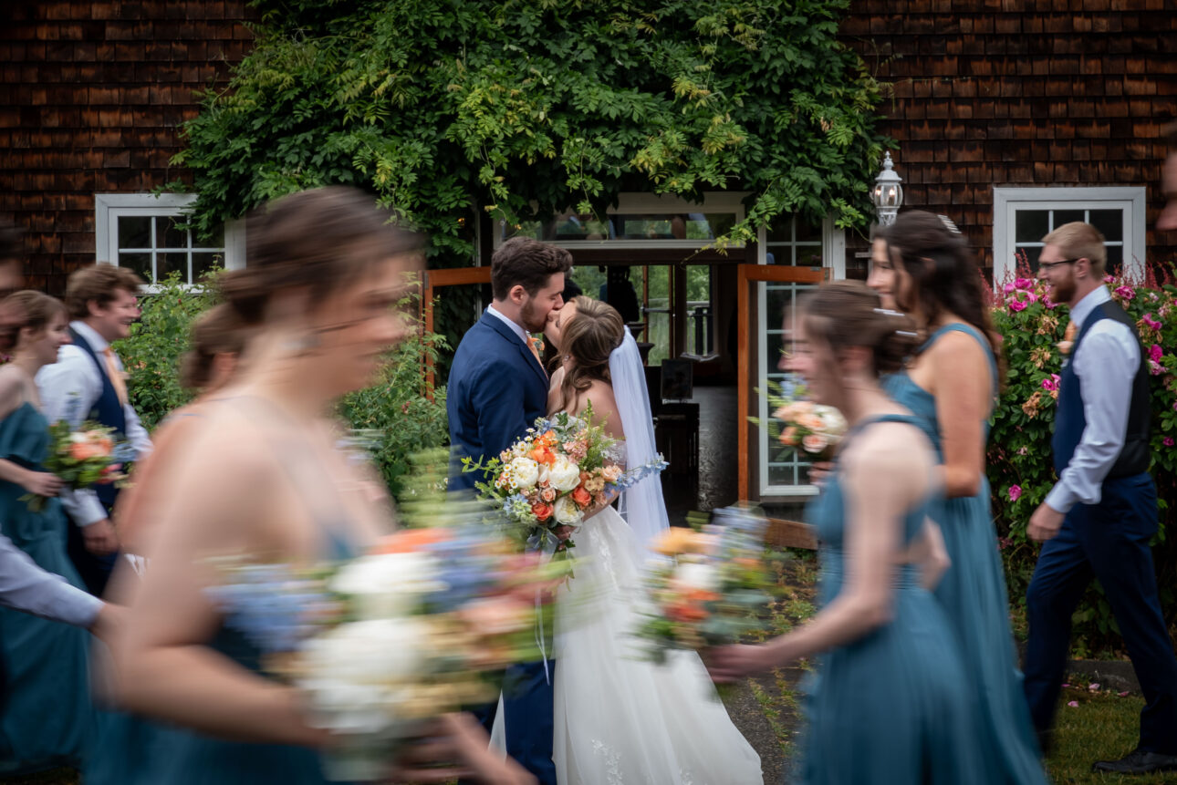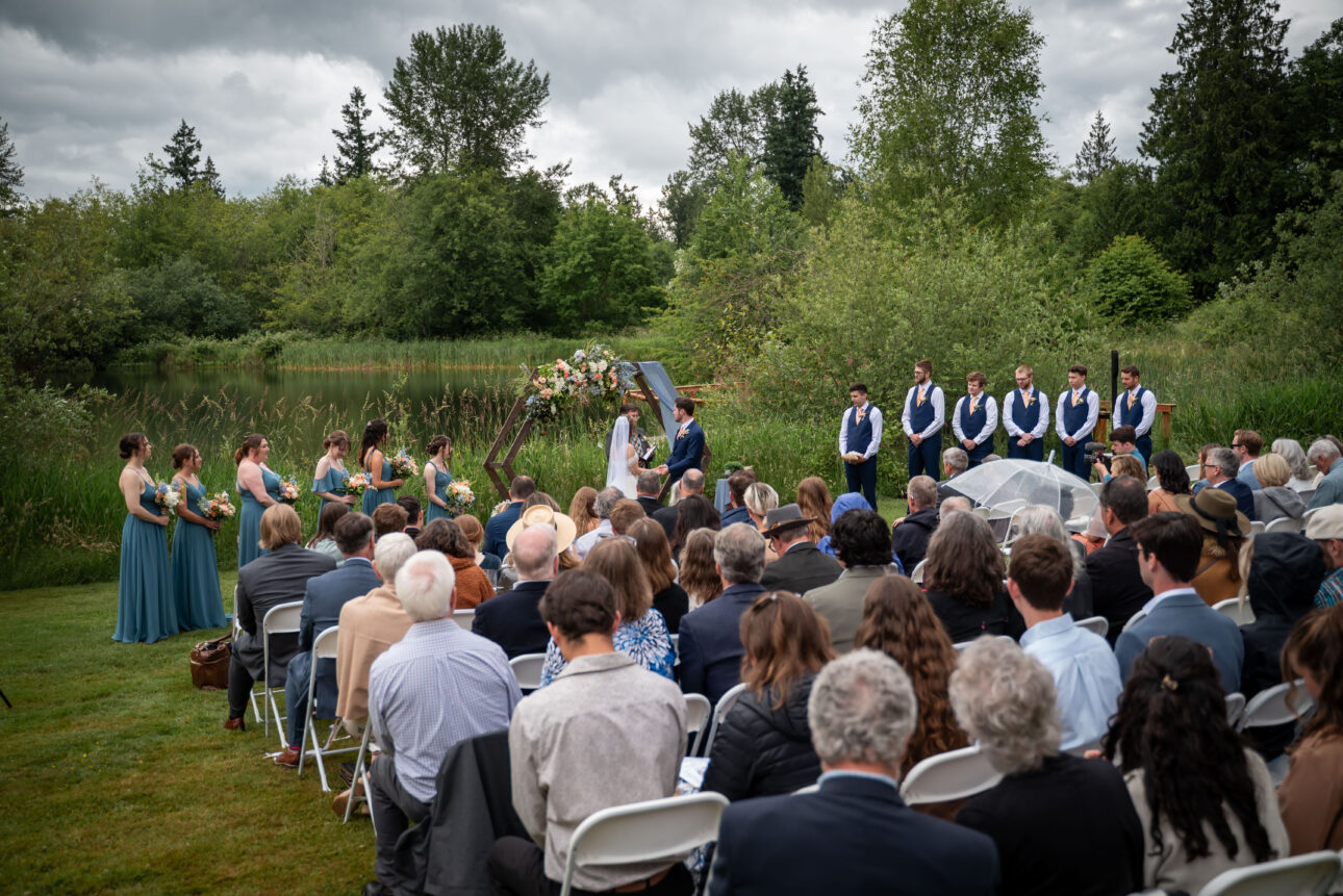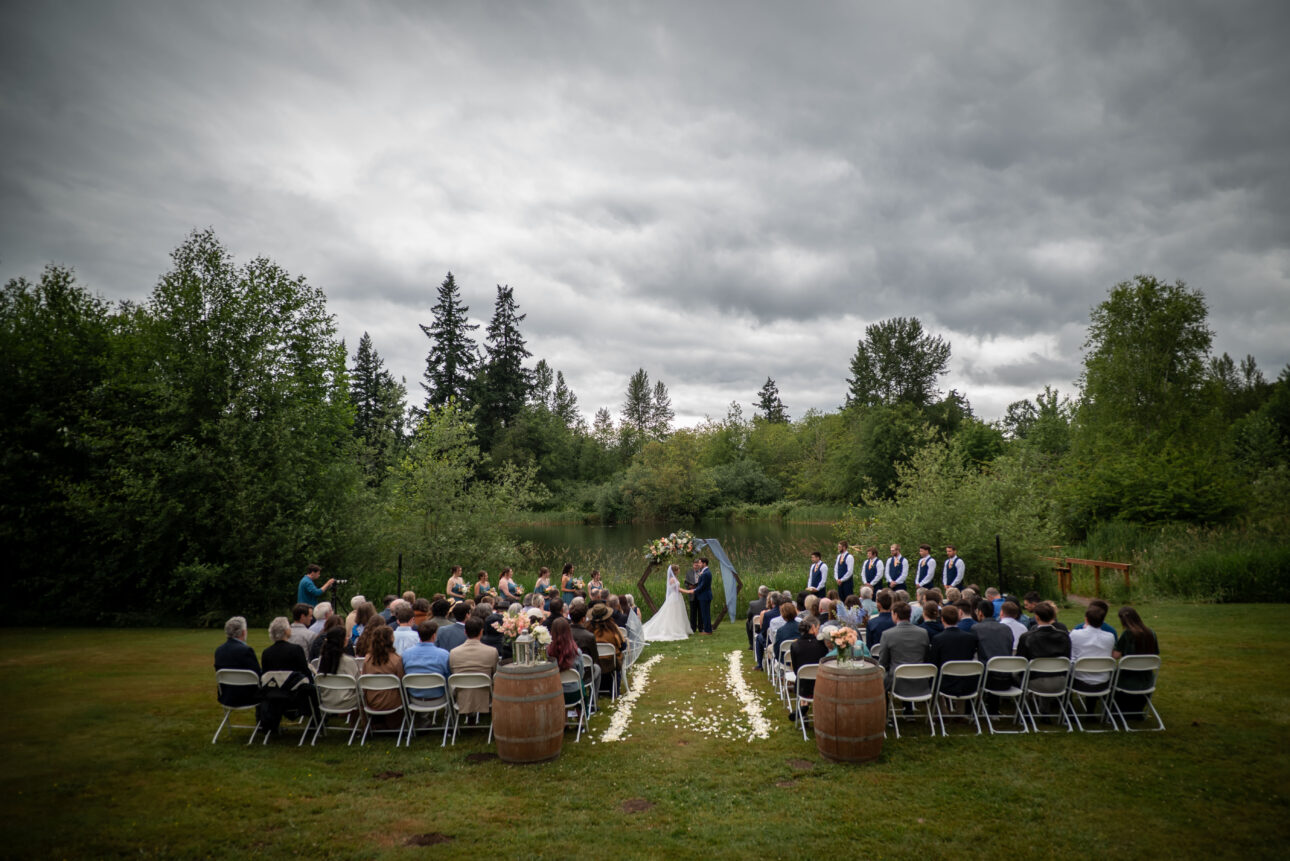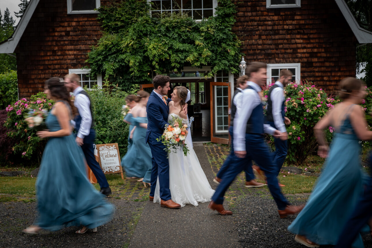 The rain followed me the entire drive, steady and relentless, until the moment I arrived. Almost on cue, it softened into a mist and then disappeared completely just in time for their first look. By the time they saw each other, the air was calm and the rain had disappeared, leaving behind the freshest scent and a crisp, clear backdrop for their love story. As a Pacific Northwest Wedding Photographer, these are the moments I live for — when the weather shifts just enough to feel like part of the story rather than a challenge. While we moved into formal portraits the groomsmen dried off the morning rain from the ceremony chairs behind me. I love that busy wedding energy, when everything in front of my lens looks immaculate and completely romantic because behind me a community is rallying together.