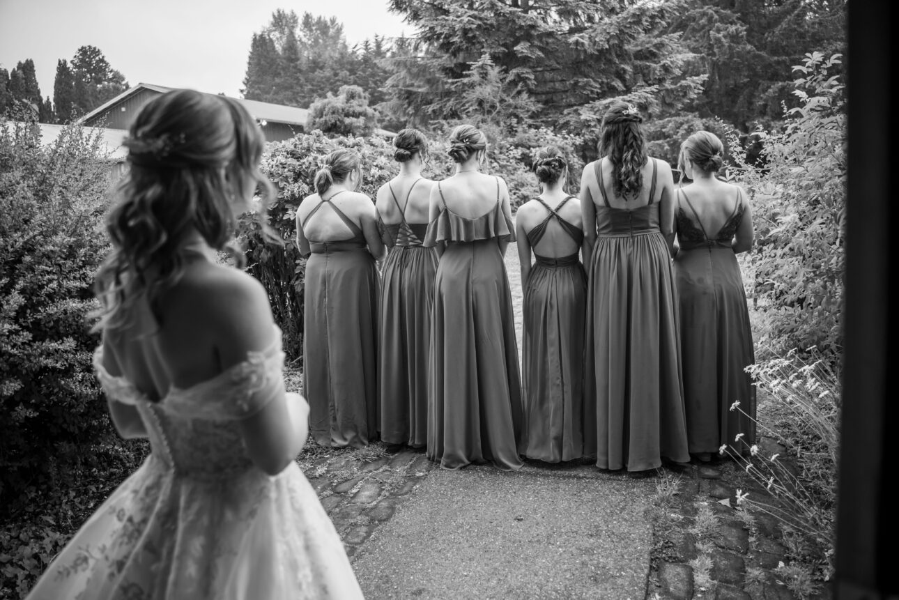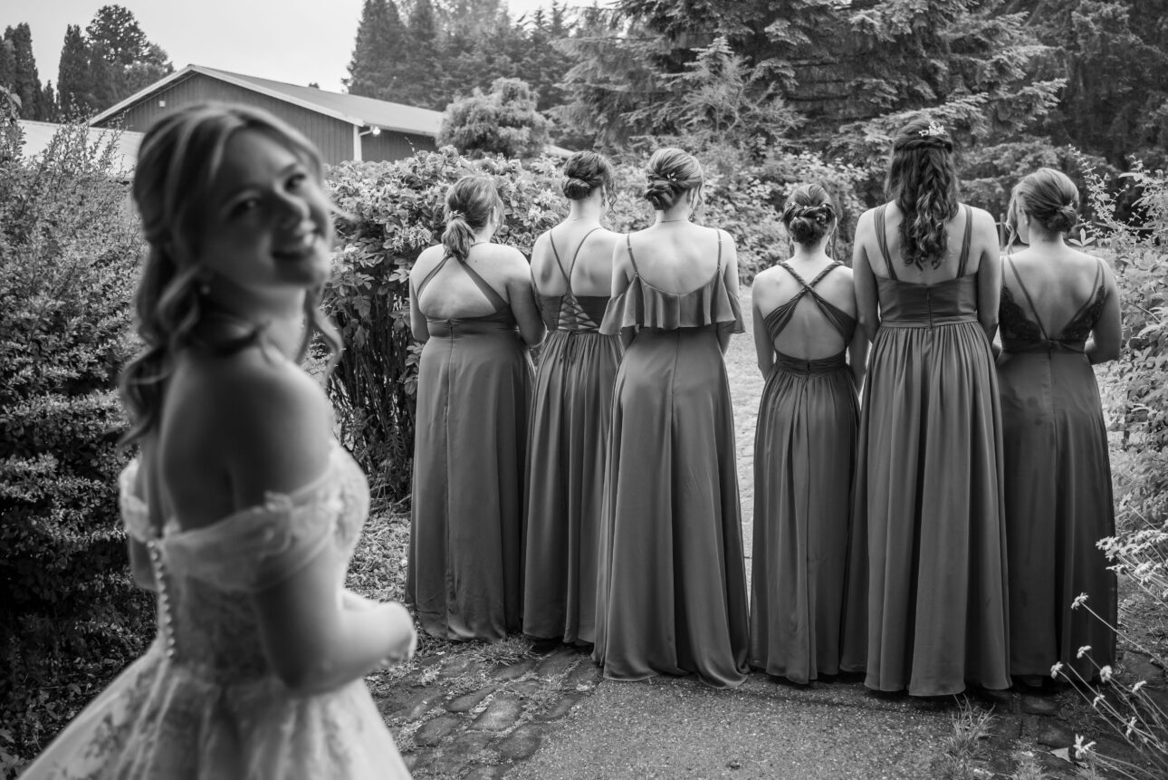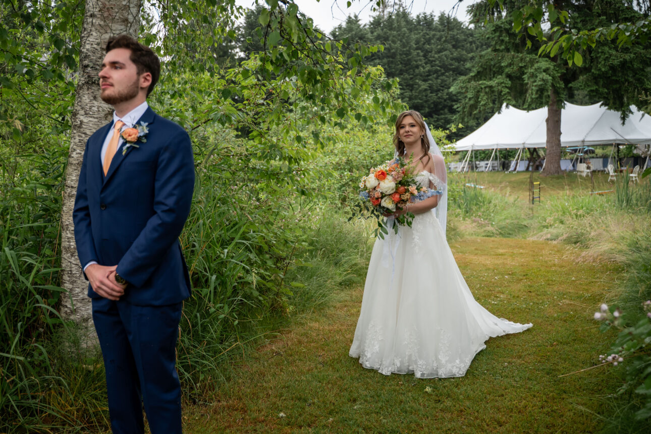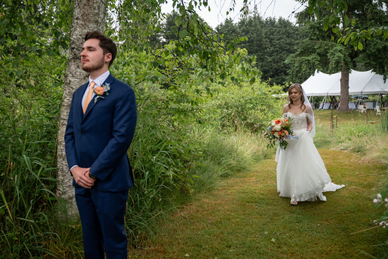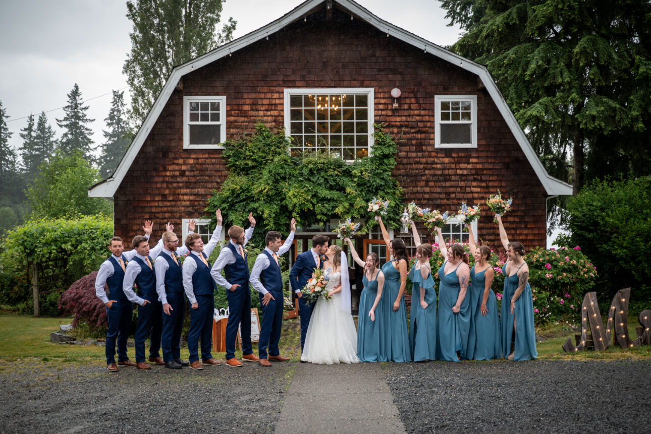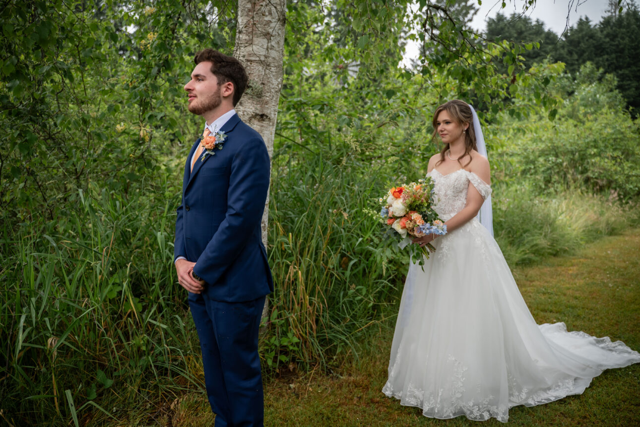 The rain followed me the entire drive, steady and relentless, until the moment I arrived. Almost on cue, it softened into a mist and then disappeared completely just in time for their first look. By the time they saw each other, the air was calm and the rain had disappeared, leaving behind the freshest scent and a crisp, clear backdrop for their love story. As a Pacific Northwest Wedding Photographer, these are the moments I live for — when the weather shifts just enough to feel like part of the story rather than a challenge. While we moved into formal portraits the groomsmen dried off the morning rain from the ceremony chairs behind me. I love that busy wedding energy, when everything in front of my lens looks immaculate and completely romantic because behind me a community is rallying together.