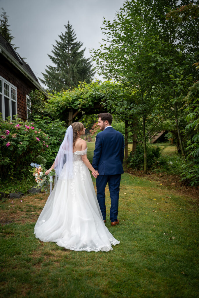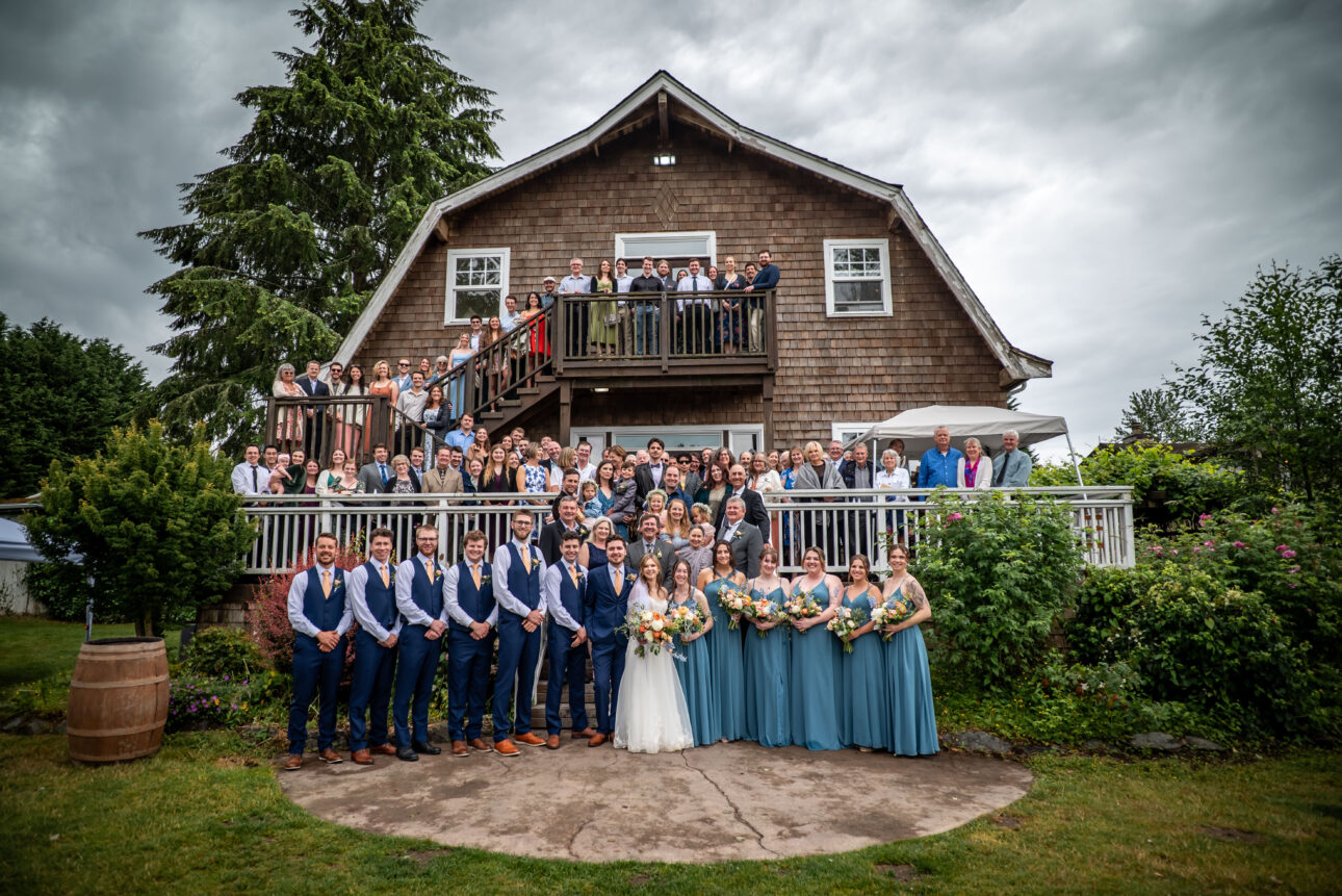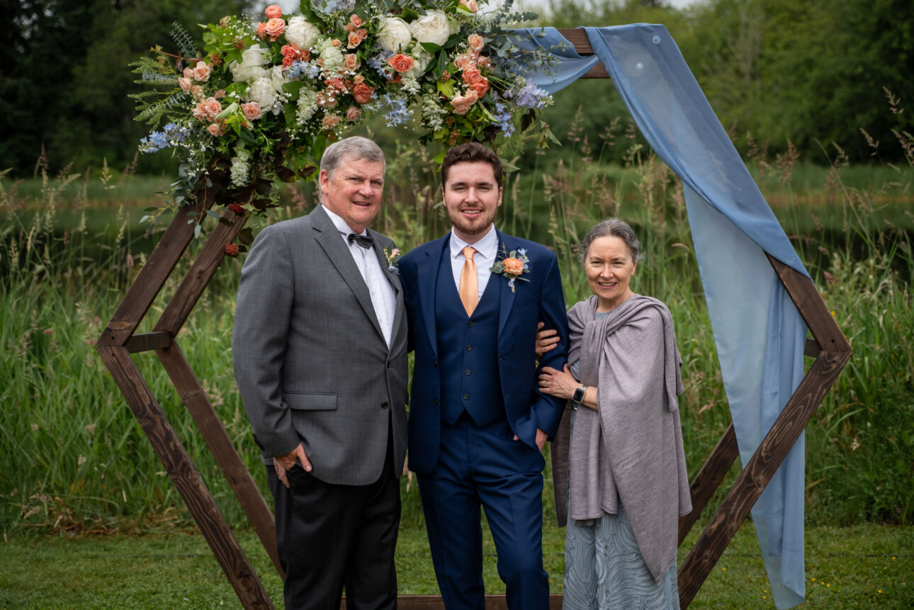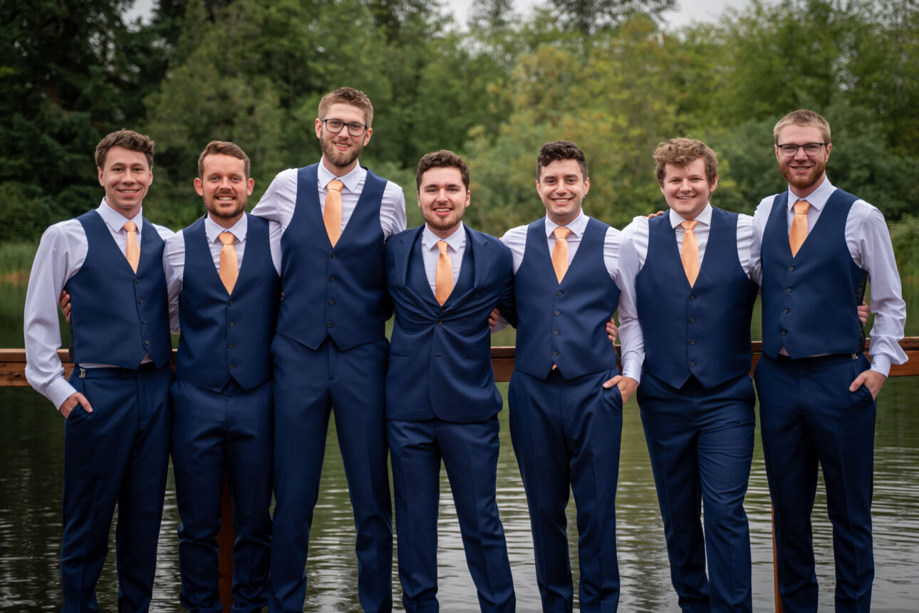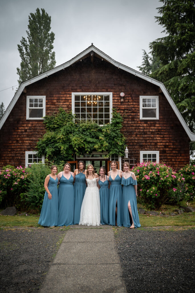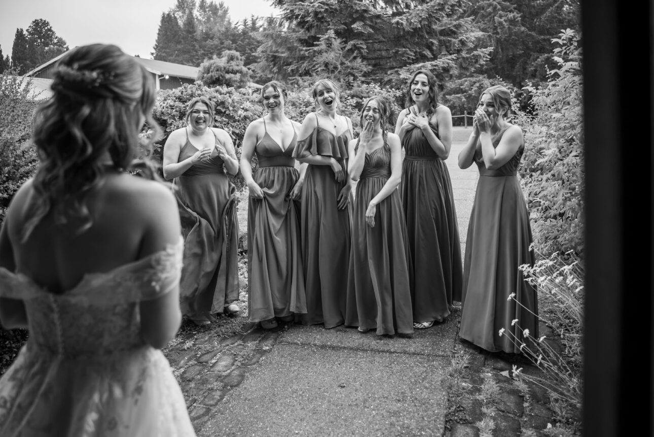 The rain followed me the entire drive, steady and relentless, until the moment I arrived. Almost on cue, it softened into a mist and then disappeared completely just in time for their first look. By the time they saw each other, the air was calm and the rain had disappeared, leaving behind the freshest scent and a crisp, clear backdrop for their love story. As a Pacific Northwest Wedding Photographer, these are the moments I live for — when the weather shifts just enough to feel like part of the story rather than a challenge. While we moved into formal portraits the groomsmen dried off the morning rain from the ceremony chairs behind me. I love that busy wedding energy, when everything in front of my lens looks immaculate and completely romantic because behind me a community is rallying together.