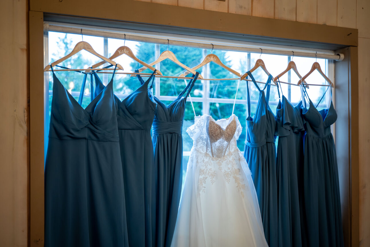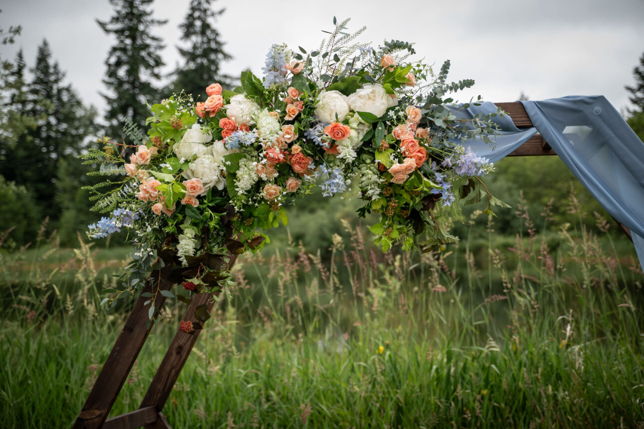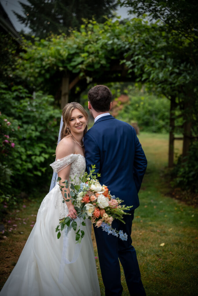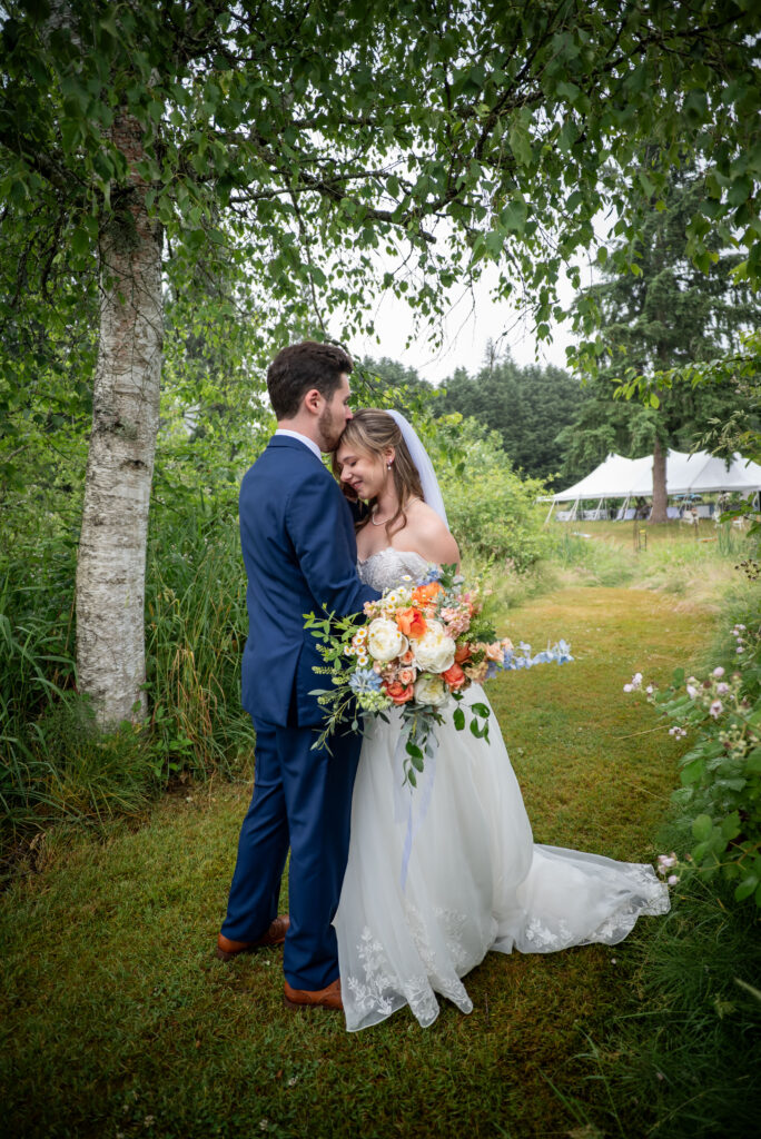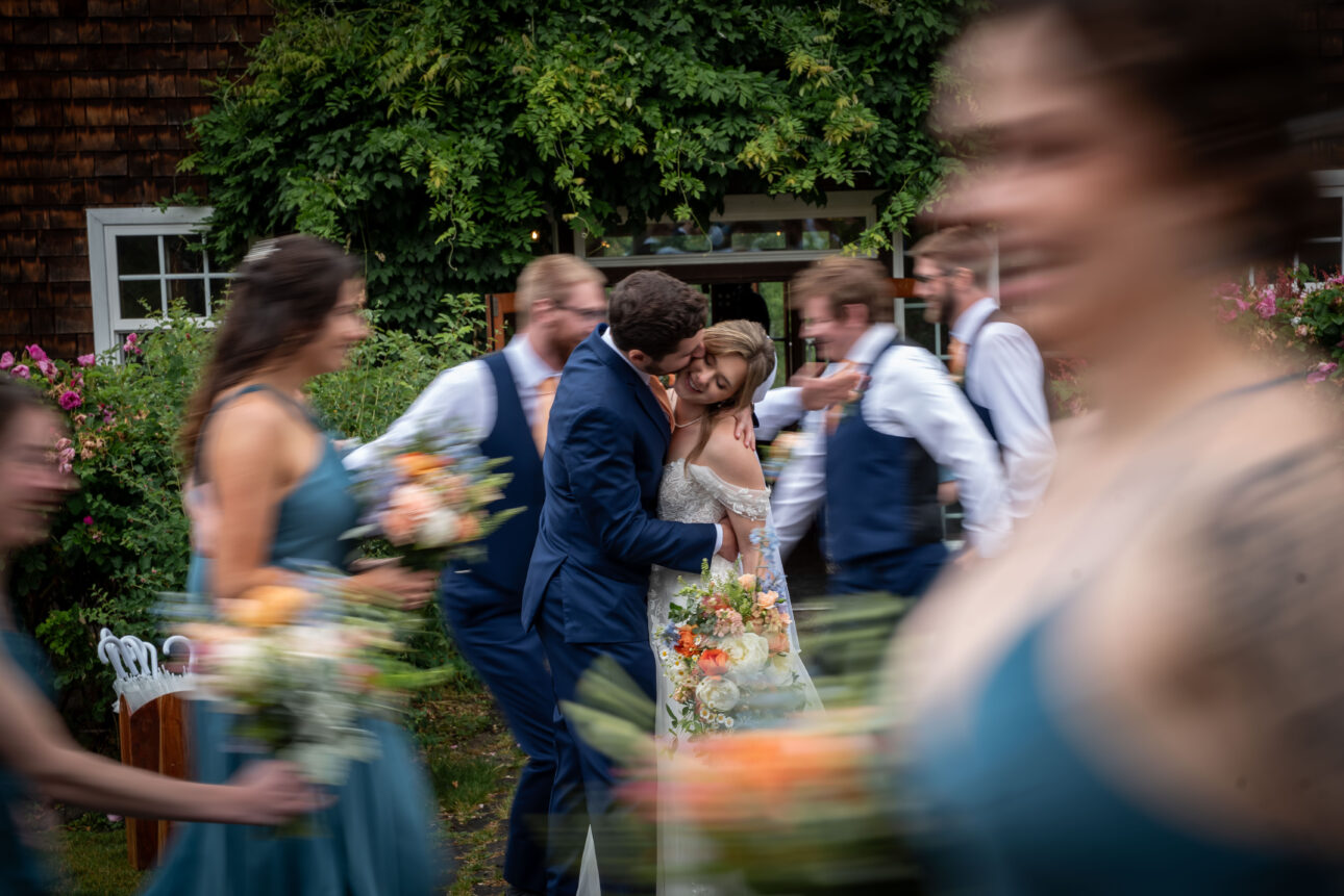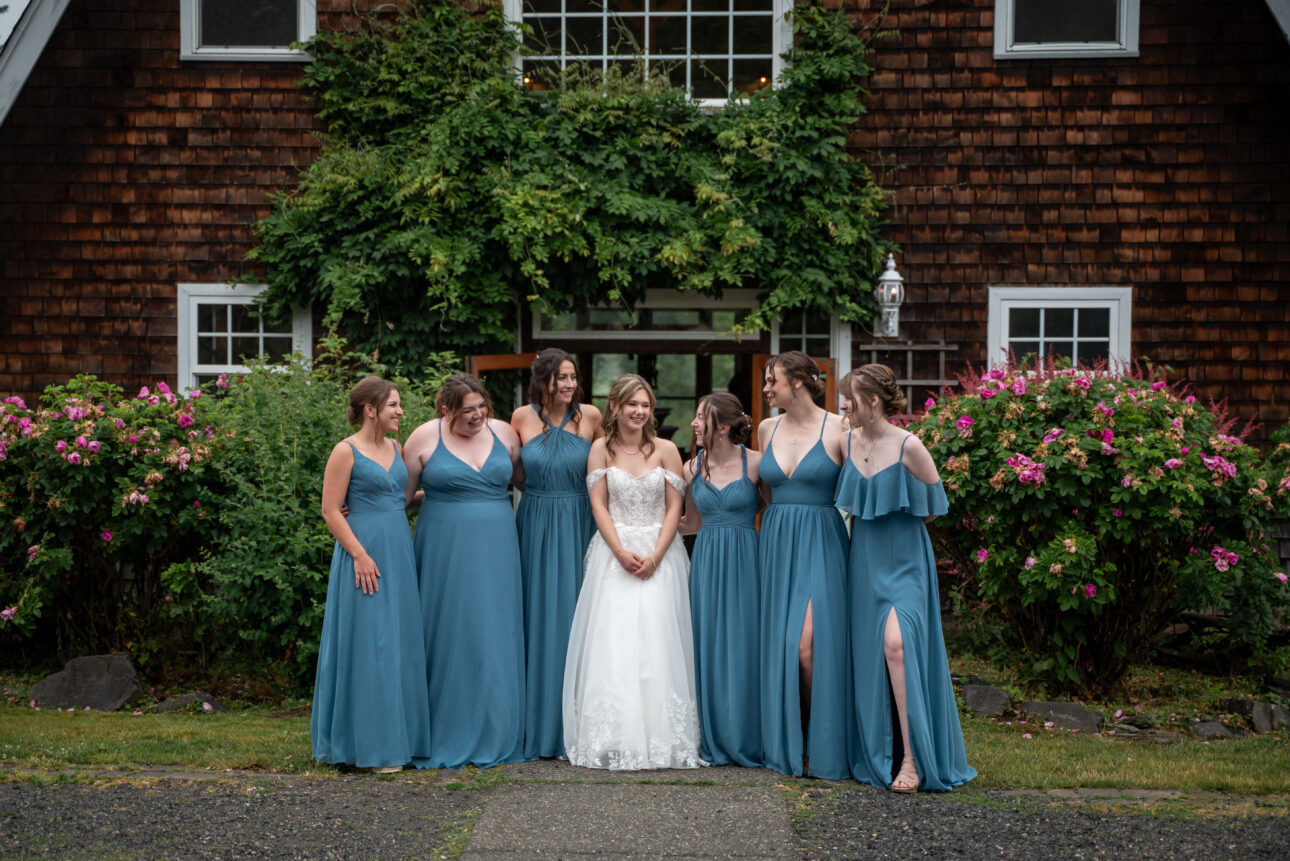 The rain followed me the entire drive, steady and relentless, until the moment I arrived. Almost on cue, it softened into a mist and then disappeared completely just in time for their first look. By the time they saw each other, the air was calm and the rain had disappeared, leaving behind the freshest scent and a crisp, clear backdrop for their love story. As a Pacific Northwest Wedding Photographer, these are the moments I live for — when the weather shifts just enough to feel like part of the story rather than a challenge. While we moved into formal portraits the groomsmen dried off the morning rain from the ceremony chairs behind me. I love that busy wedding energy, when everything in front of my lens looks immaculate and completely romantic because behind me a community is rallying together.
