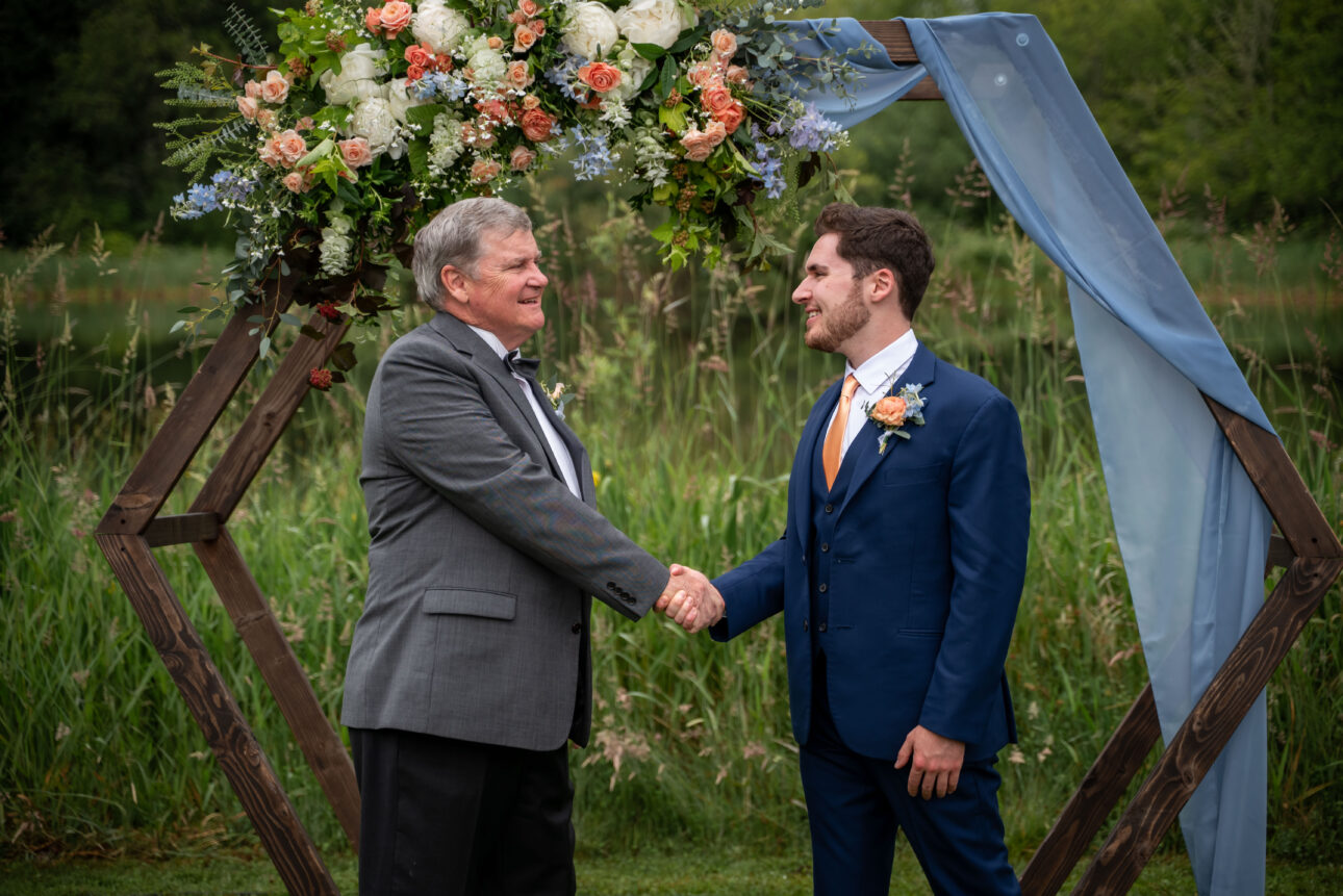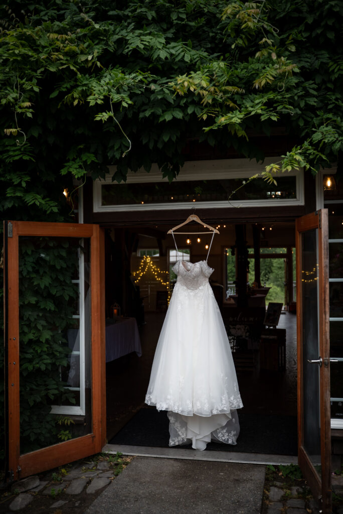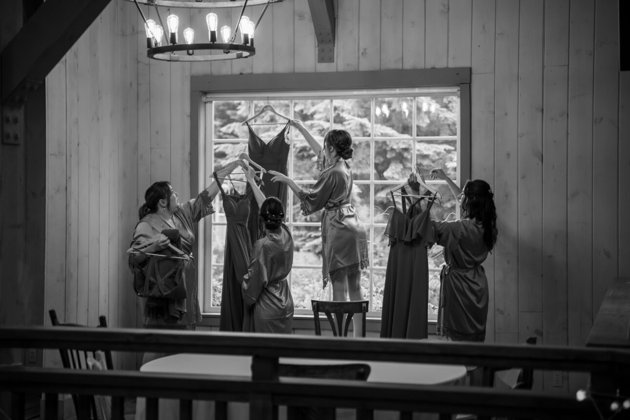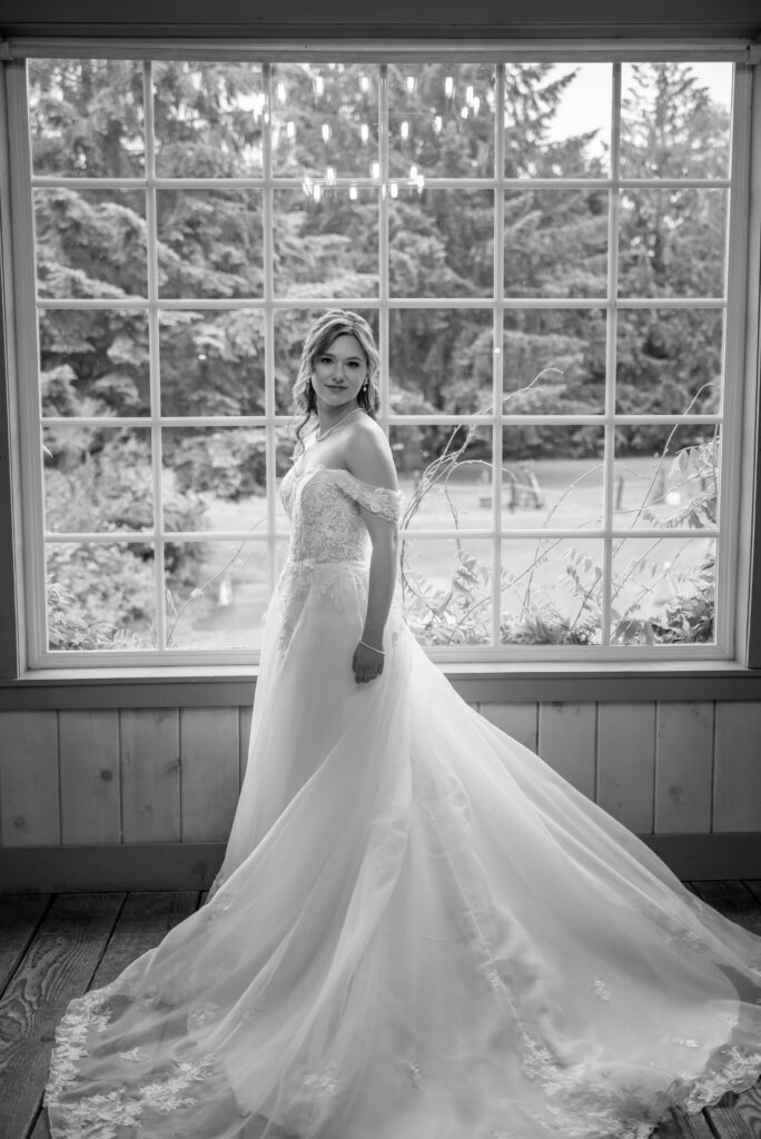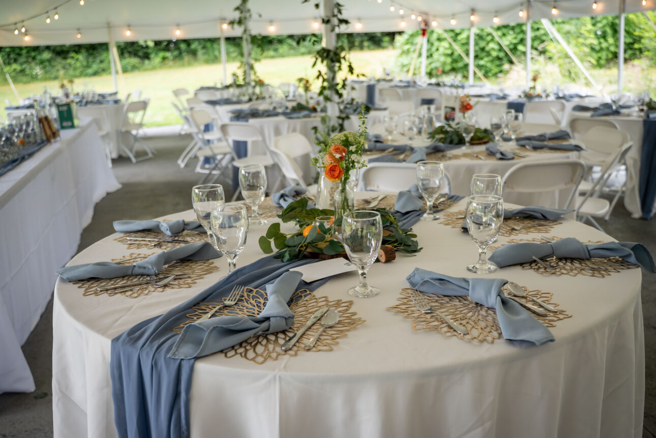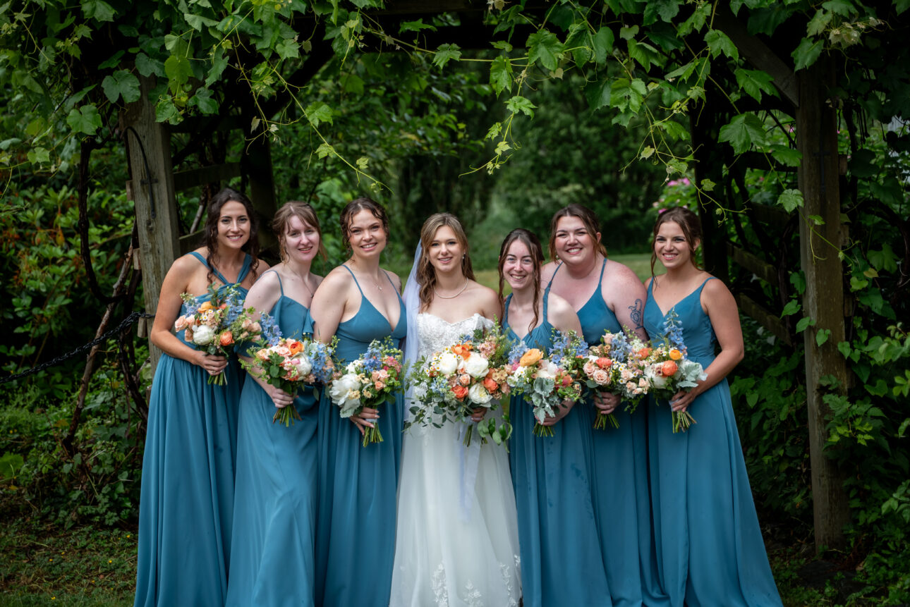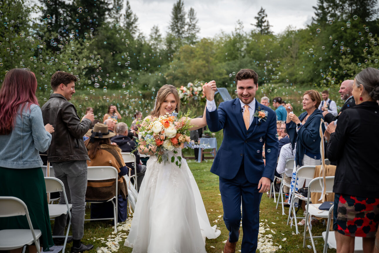 The rain followed me the entire drive, steady and relentless, until the moment I arrived. Almost on cue, it softened into a mist and then disappeared completely just in time for their first look. By the time they saw each other, the air was calm and the rain had disappeared, leaving behind the freshest scent and a crisp, clear backdrop for their love story. As a Pacific Northwest Wedding Photographer, these are the moments I live for — when the weather shifts just enough to feel like part of the story rather than a challenge. While we moved into formal portraits the groomsmen dried off the morning rain from the ceremony chairs behind me. I love that busy wedding energy, when everything in front of my lens looks immaculate and completely romantic because behind me a community is rallying together.