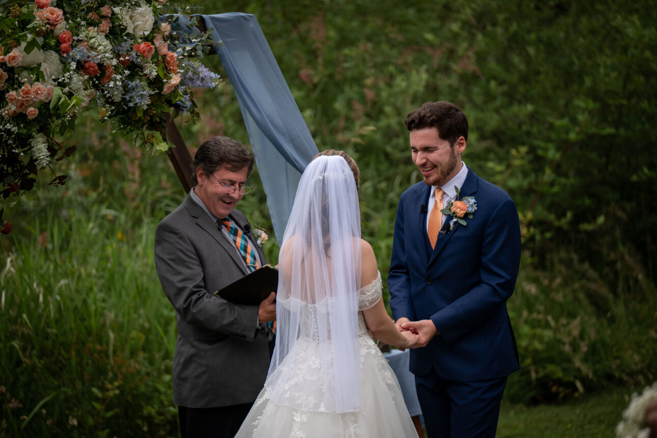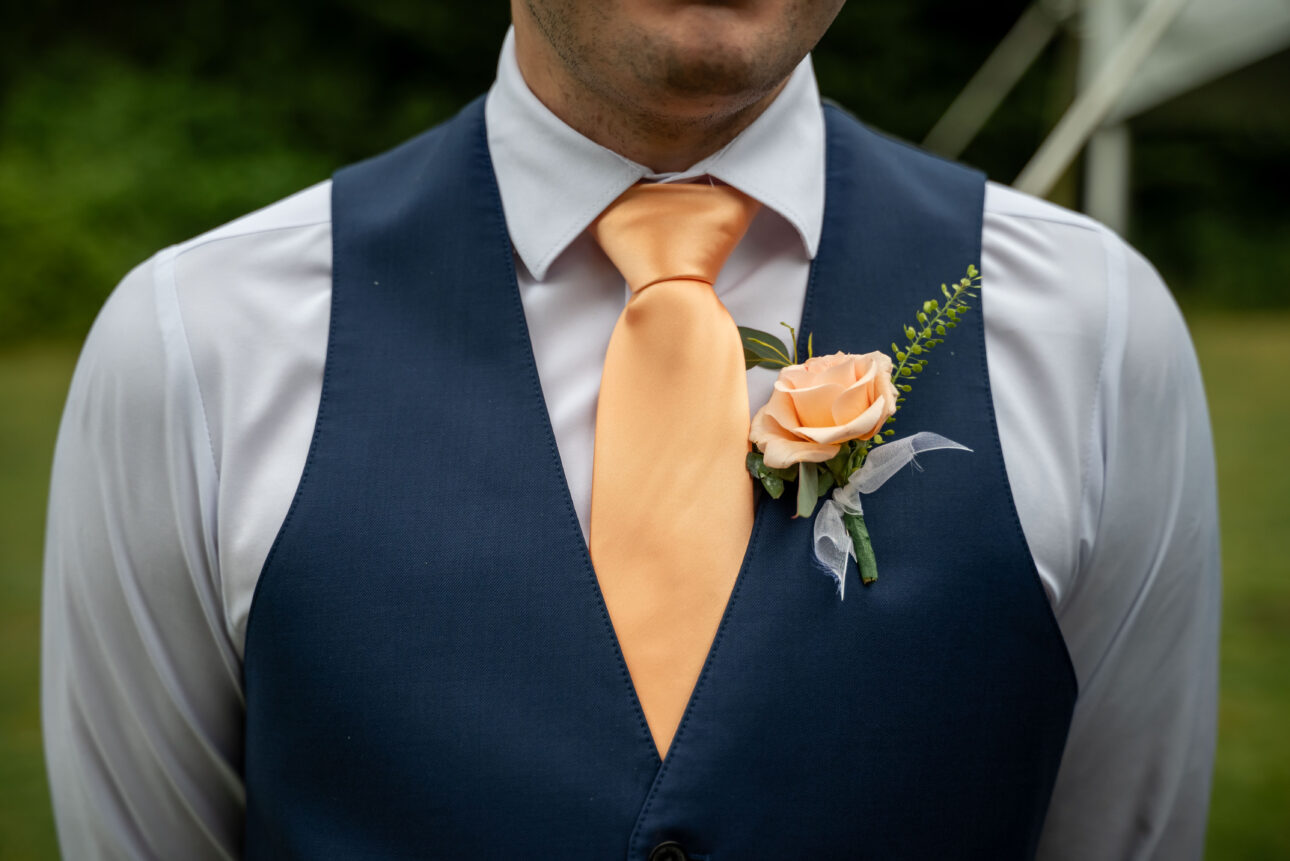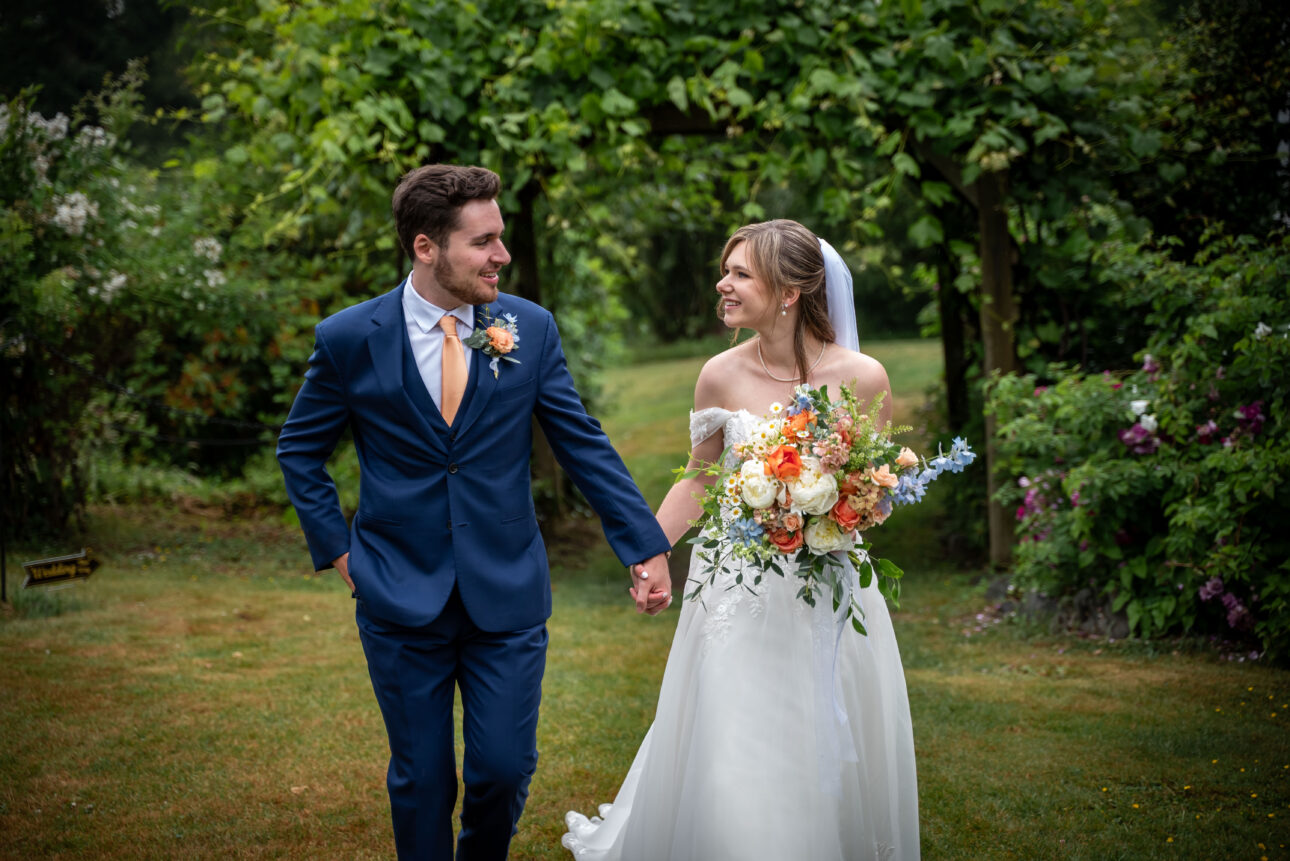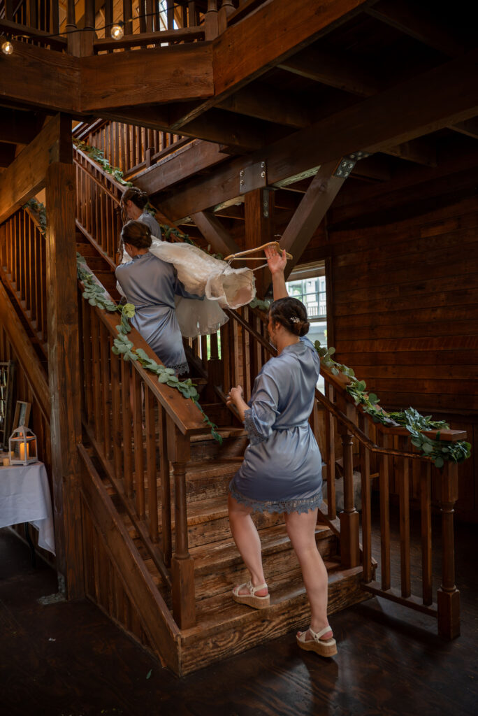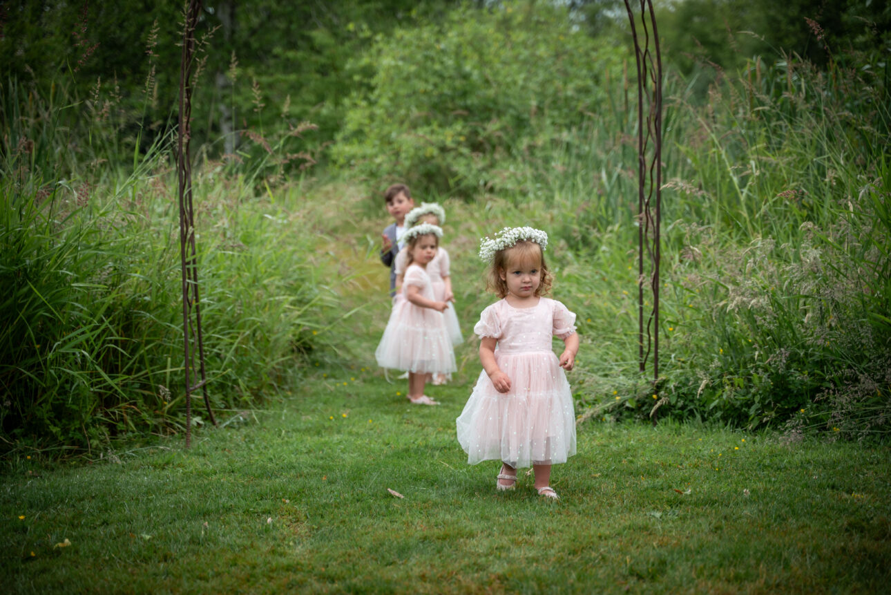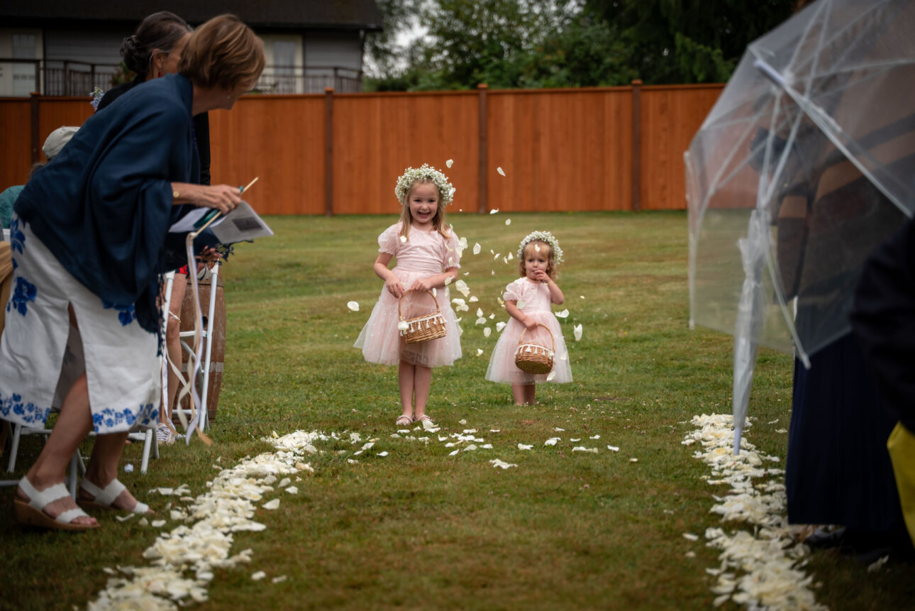 The rain followed me the entire drive, steady and relentless, until the moment I arrived. Almost on cue, it softened into a mist and then disappeared completely just in time for their first look. By the time they saw each other, the air was calm and the rain had disappeared, leaving behind the freshest scent and a crisp, clear backdrop for their love story. As a Pacific Northwest Wedding Photographer, these are the moments I live for — when the weather shifts just enough to feel like part of the story rather than a challenge. While we moved into formal portraits the groomsmen dried off the morning rain from the ceremony chairs behind me. I love that busy wedding energy, when everything in front of my lens looks immaculate and completely romantic because behind me a community is rallying together.