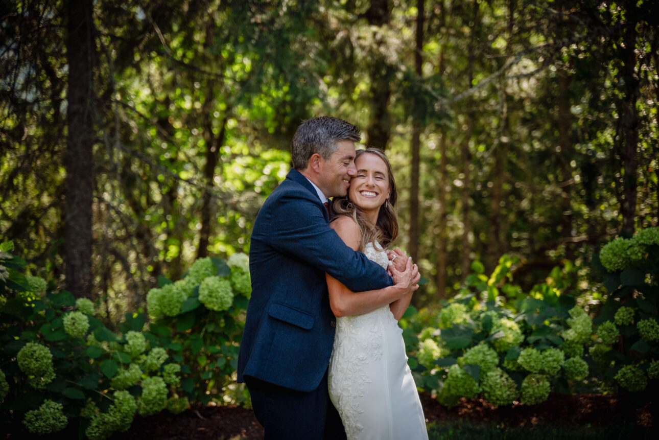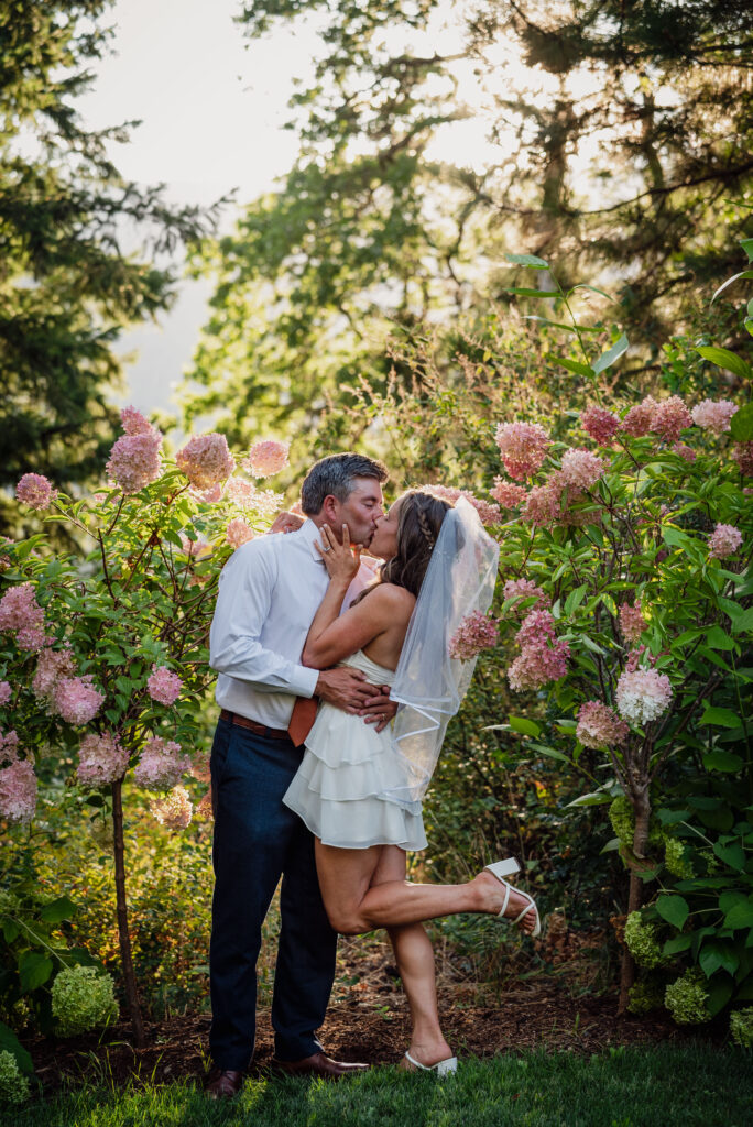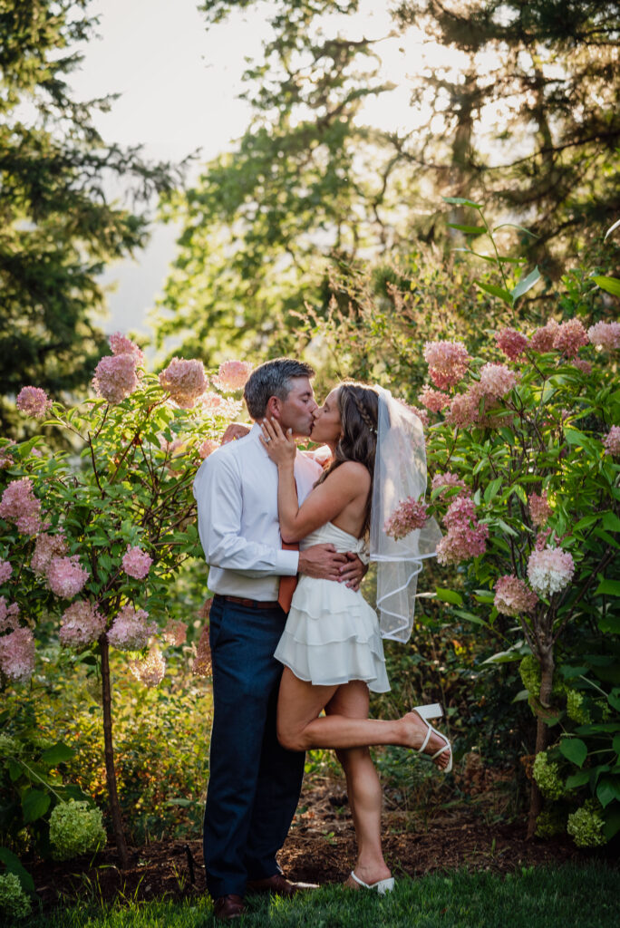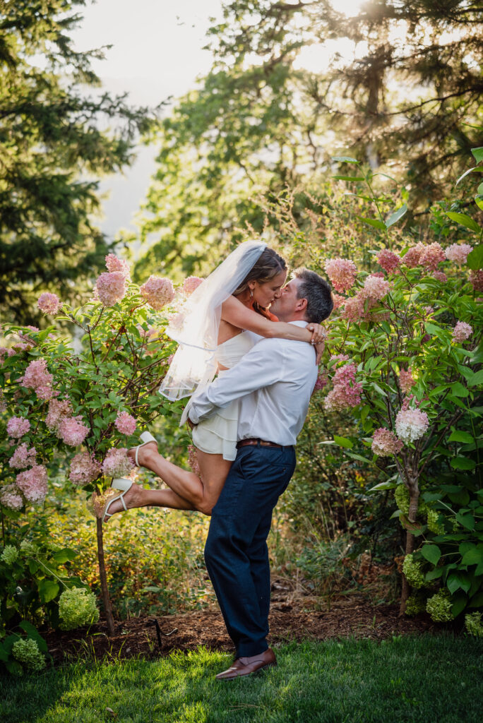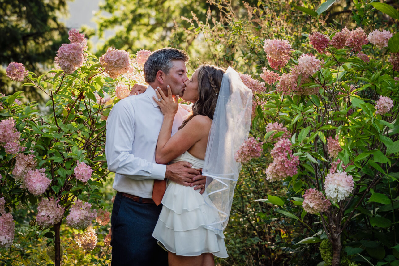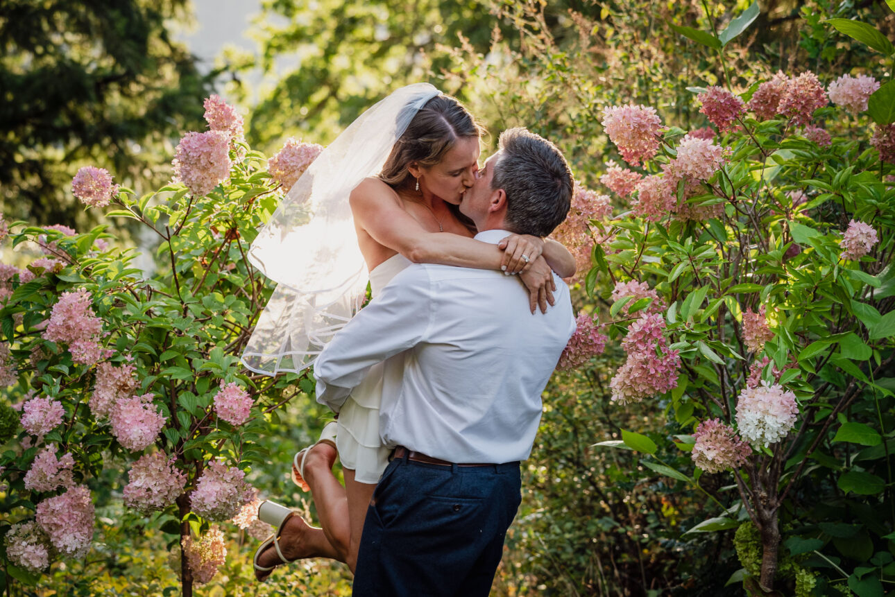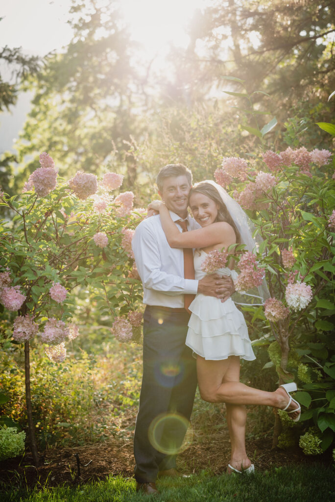 During the reception, I glanced toward the tree line and saw that golden hour light just beginning to glow behind it. I immediately went searching for the couple. Once I found them, we slipped off the dance floor and made our way to some beautiful bushes in full bloom—and just like that, golden hour was officially on.