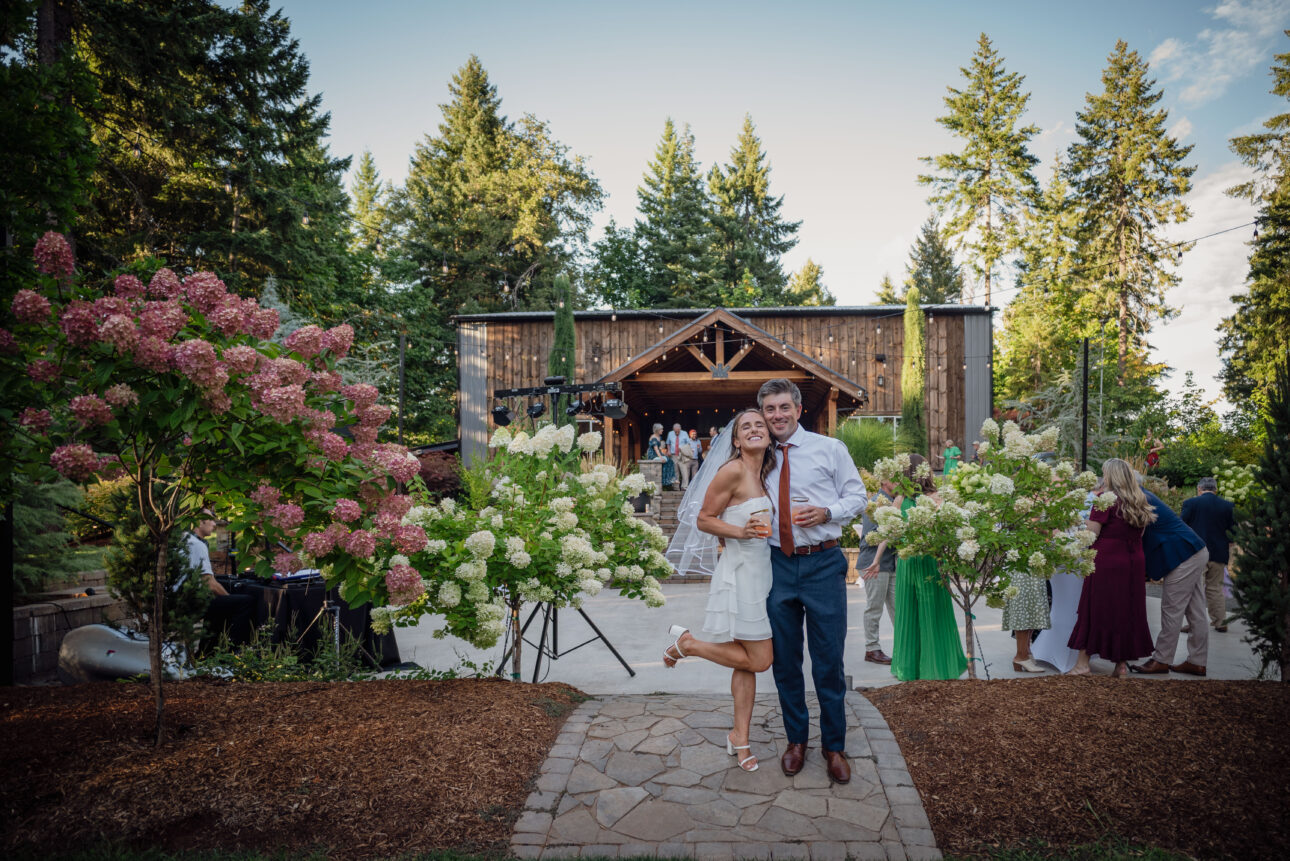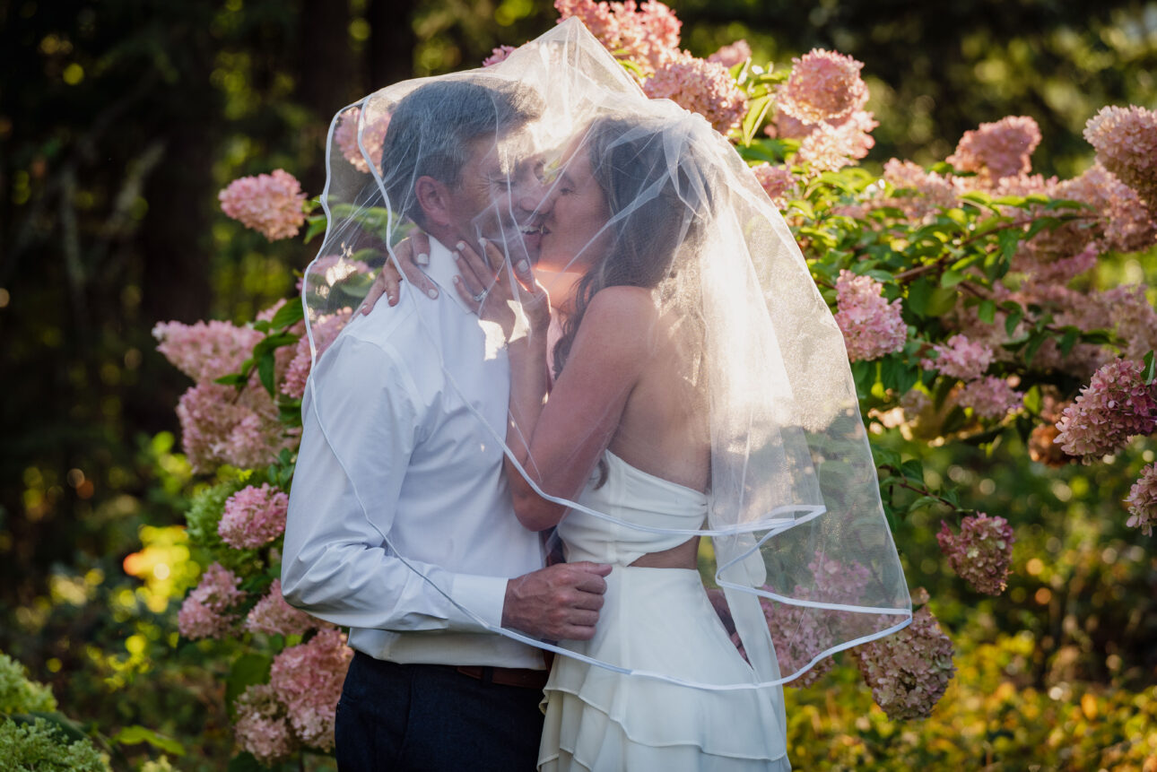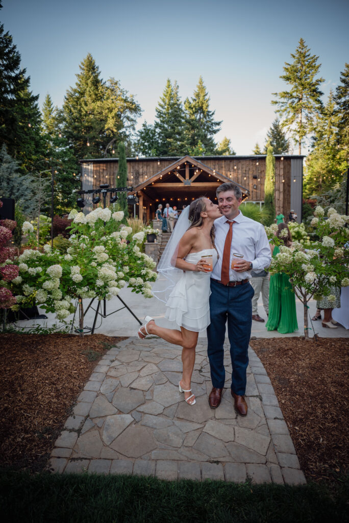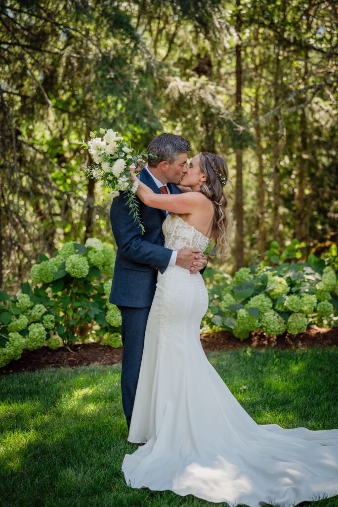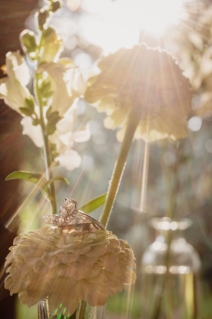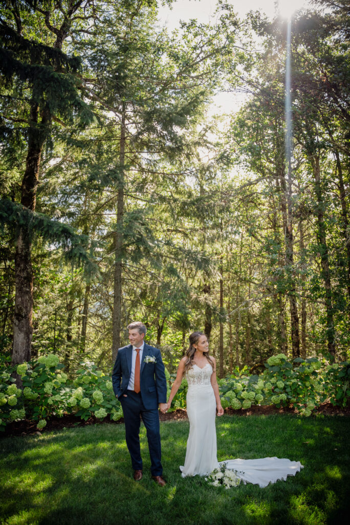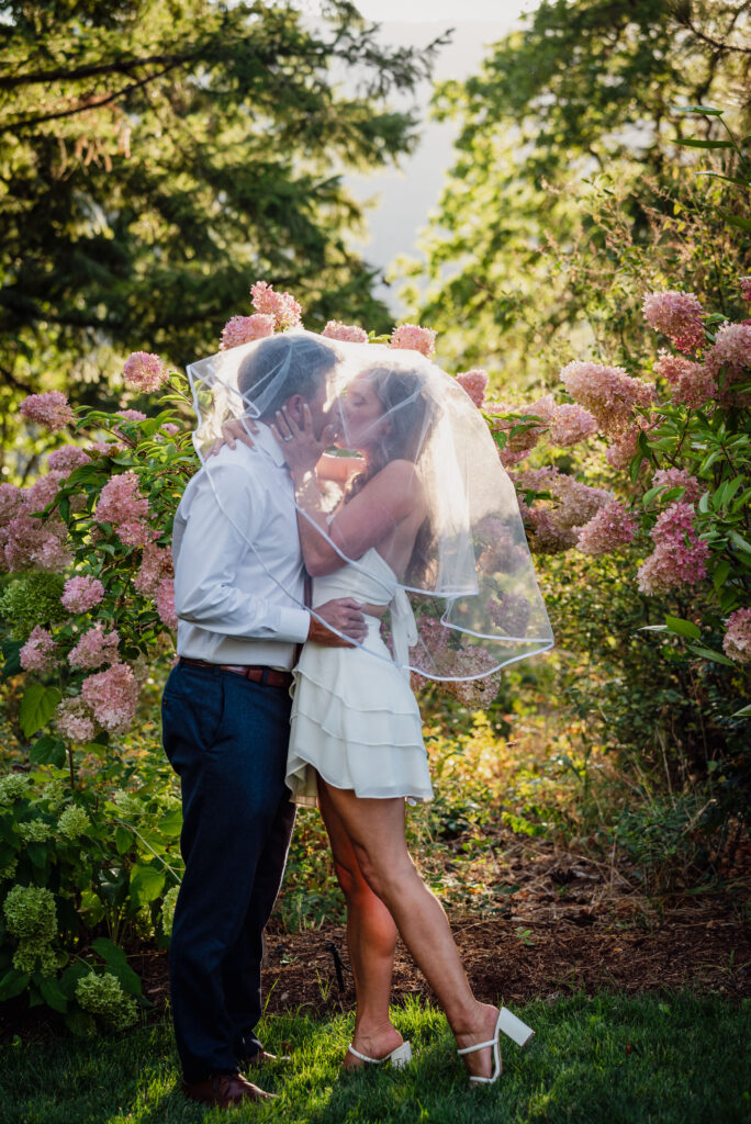 During the reception, I glanced toward the tree line and saw that golden hour light just beginning to glow behind it. I immediately went searching for the couple. Once I found them, we slipped off the dance floor and made our way to some beautiful bushes in full bloom—and just like that, golden hour was officially on.