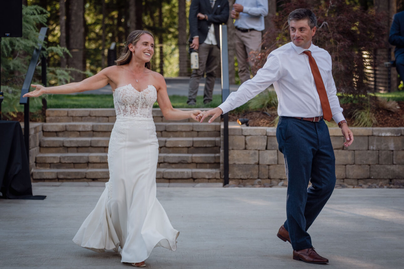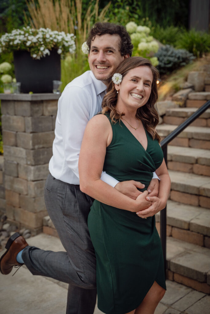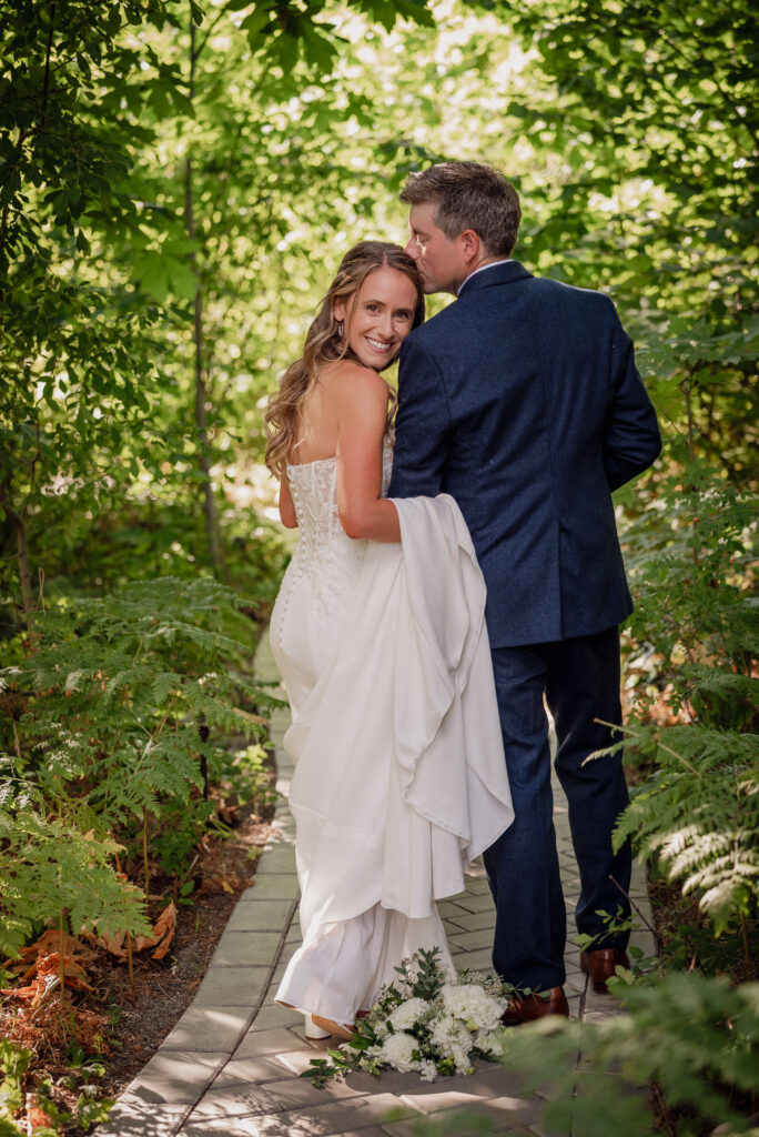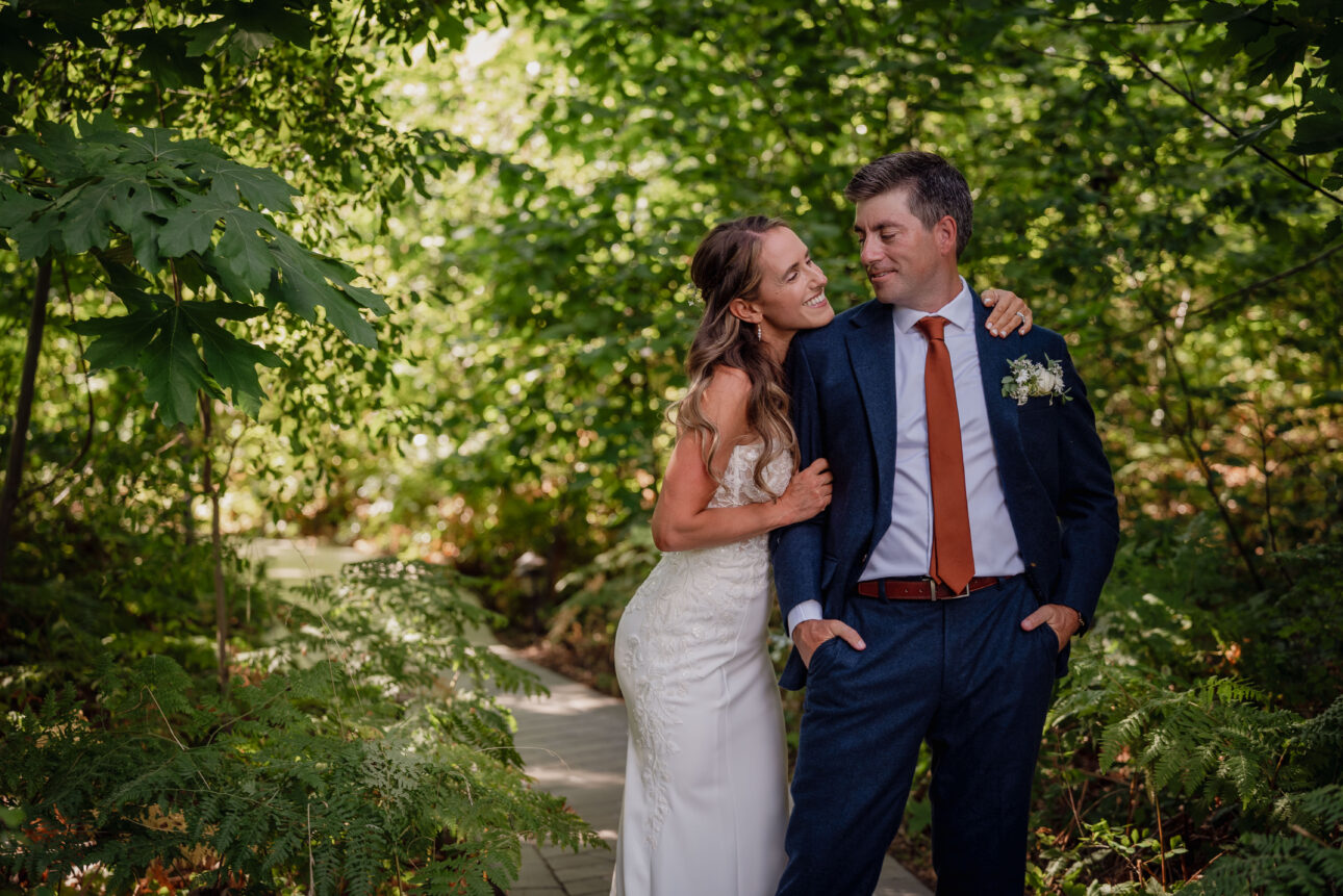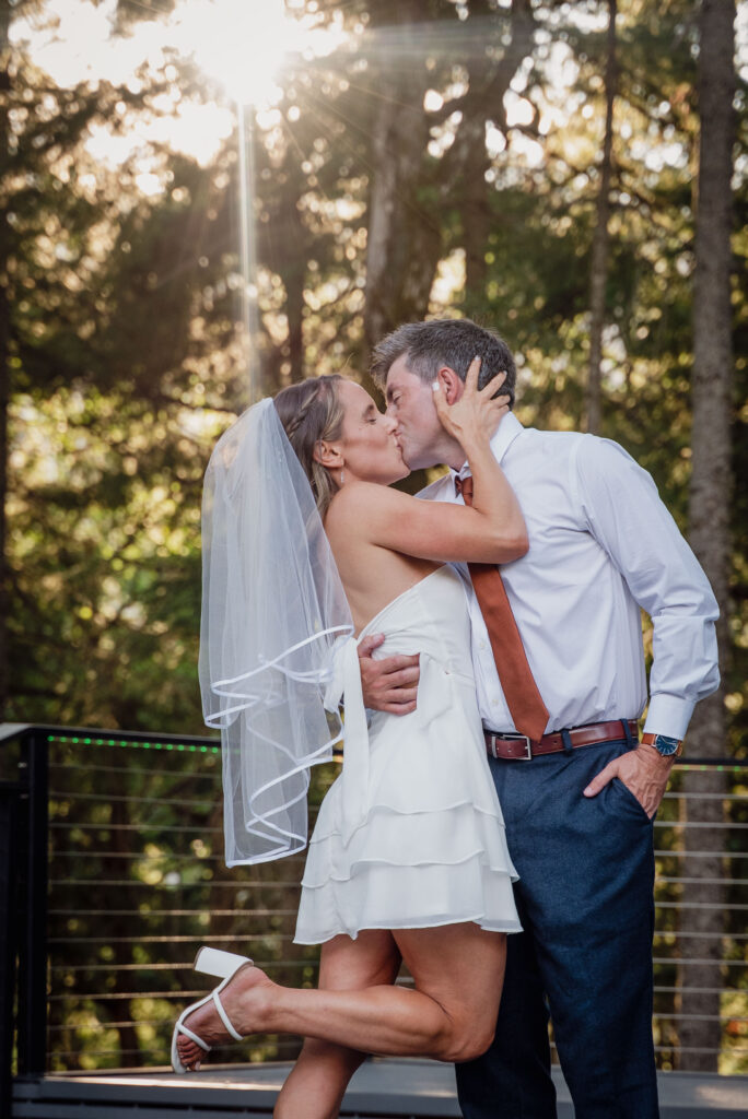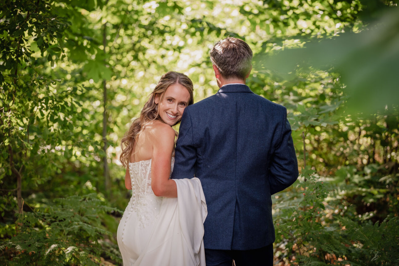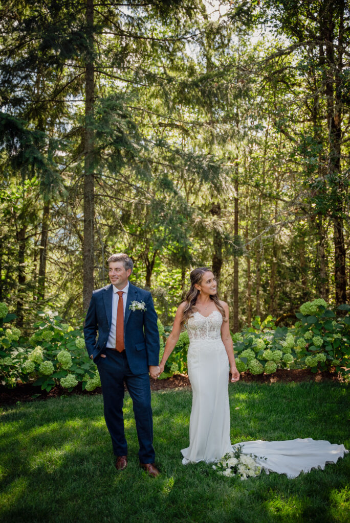 During the reception, I glanced toward the tree line and saw that golden hour light just beginning to glow behind it. I immediately went searching for the couple. Once I found them, we slipped off the dance floor and made our way to some beautiful bushes in full bloom—and just like that, golden hour was officially on.