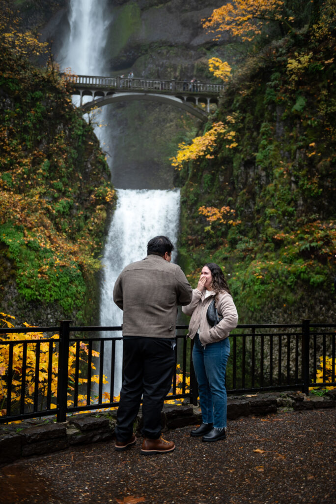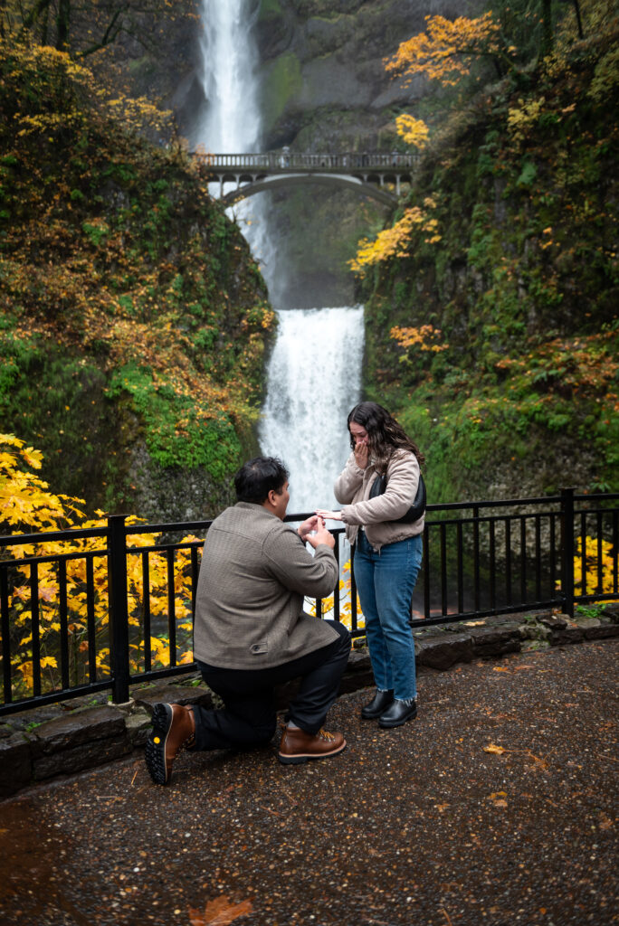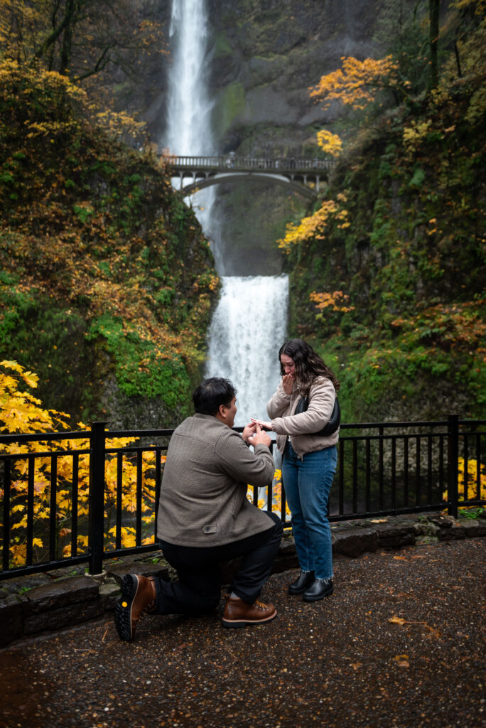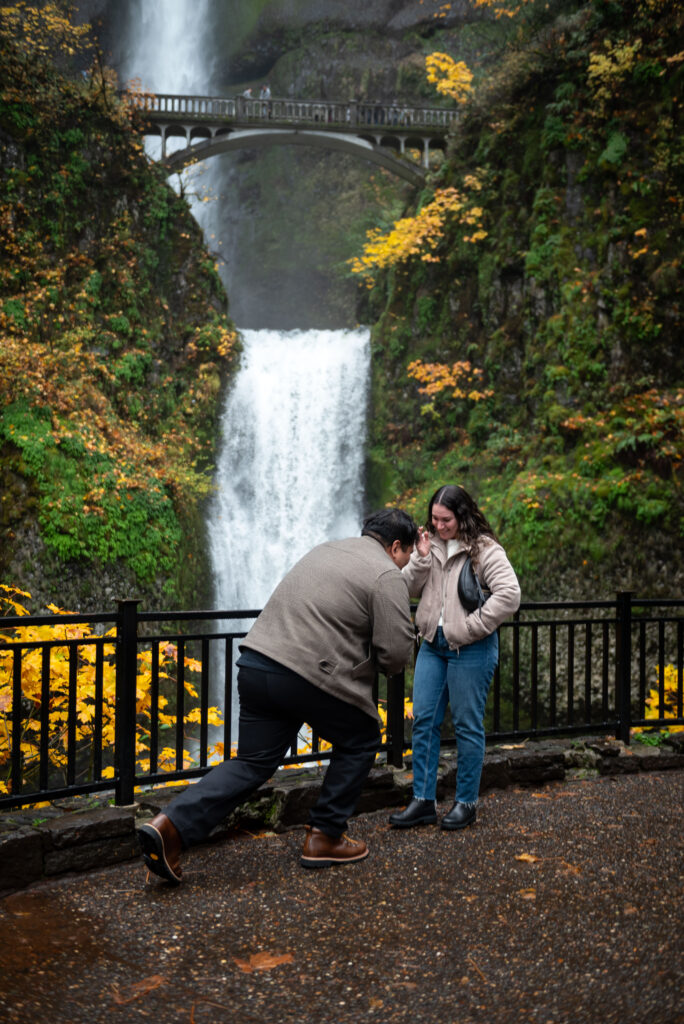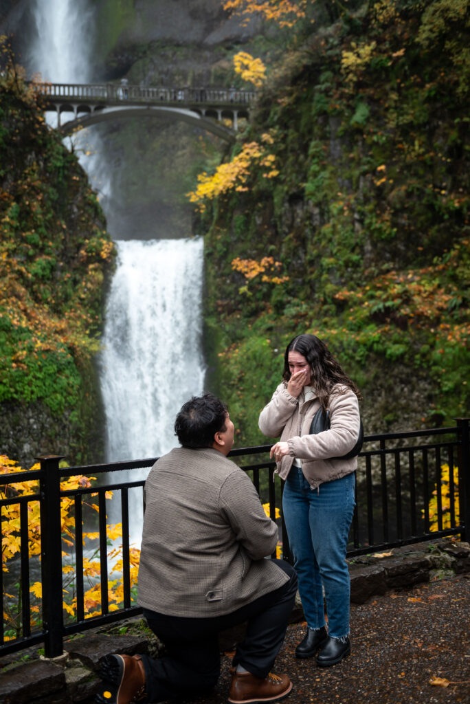Last fall, I had the absolute joy of helping plan and photograph a surprise wedding proposal at Multnomah Falls for Alfonso and Ali, and it was nothing short of magical. While organizing a weekend getaway to Oregon from California, Alfonso reached out to me and we began to coordinate every detail so the moment would be seamless. I arrived early at Multnomah Falls and blended in as a casual visitor waiting for the perfect moment. When I finally spotted Alfonso and Ali walking up to the falls, my heart was racing, right along with his I’m sure. Anticipating the second he dropped to one knee was incredibly exciting, and capturing Ali’s surprised, emotional reaction against the iconic waterfall backdrop was unforgettable.