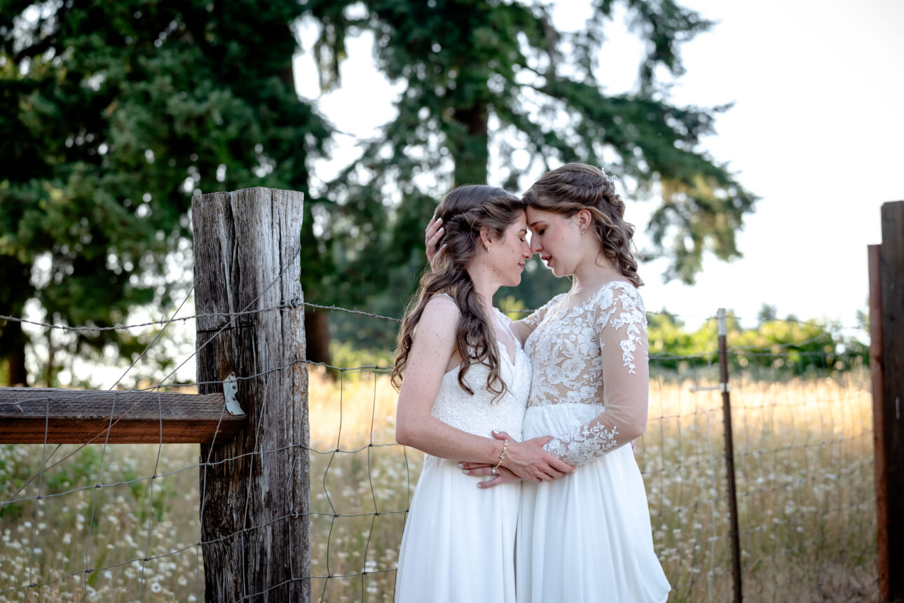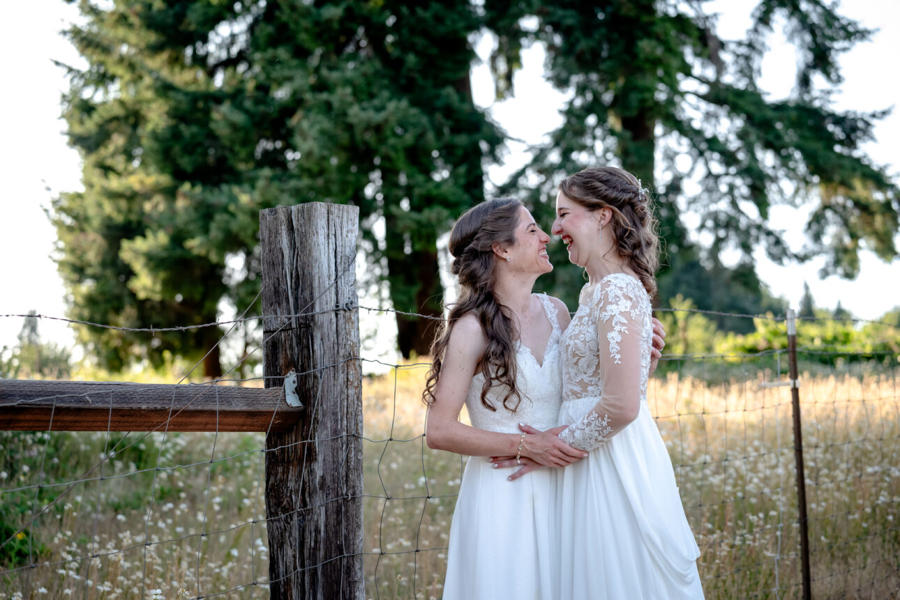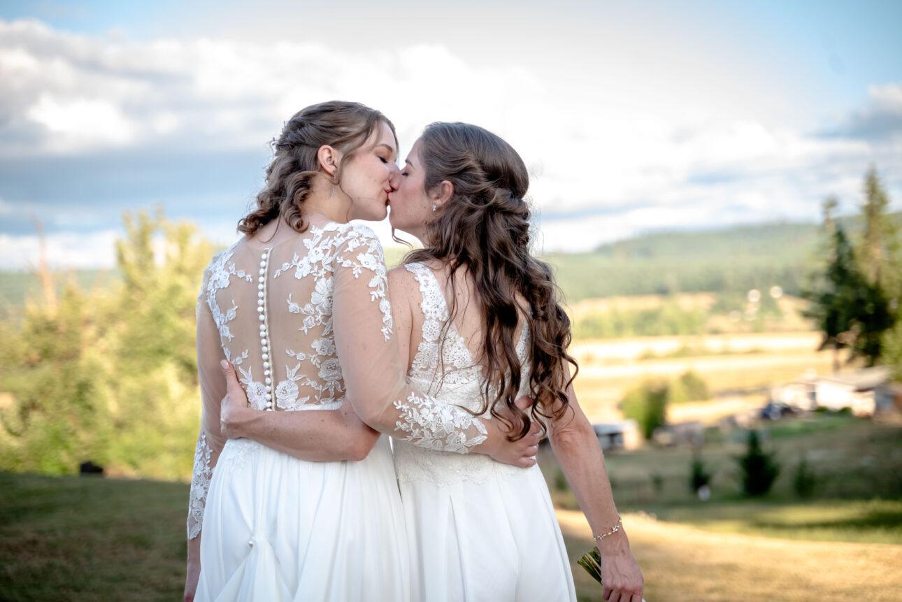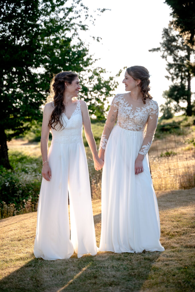 brides look at each other over looking a scenic valley in eugene oregons wine country.